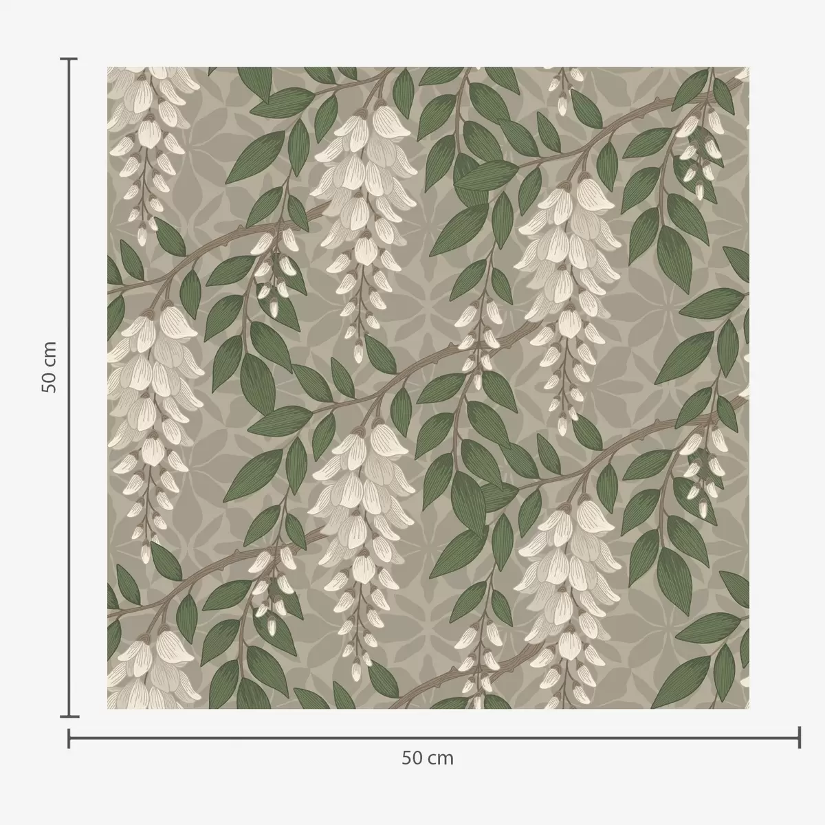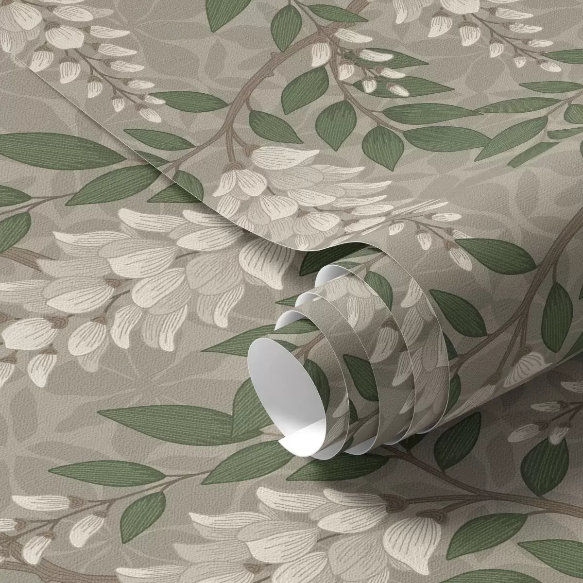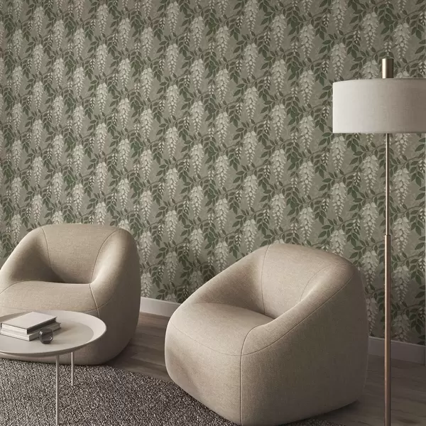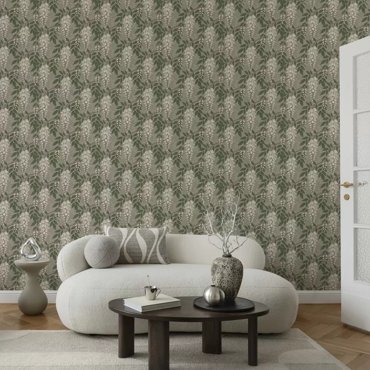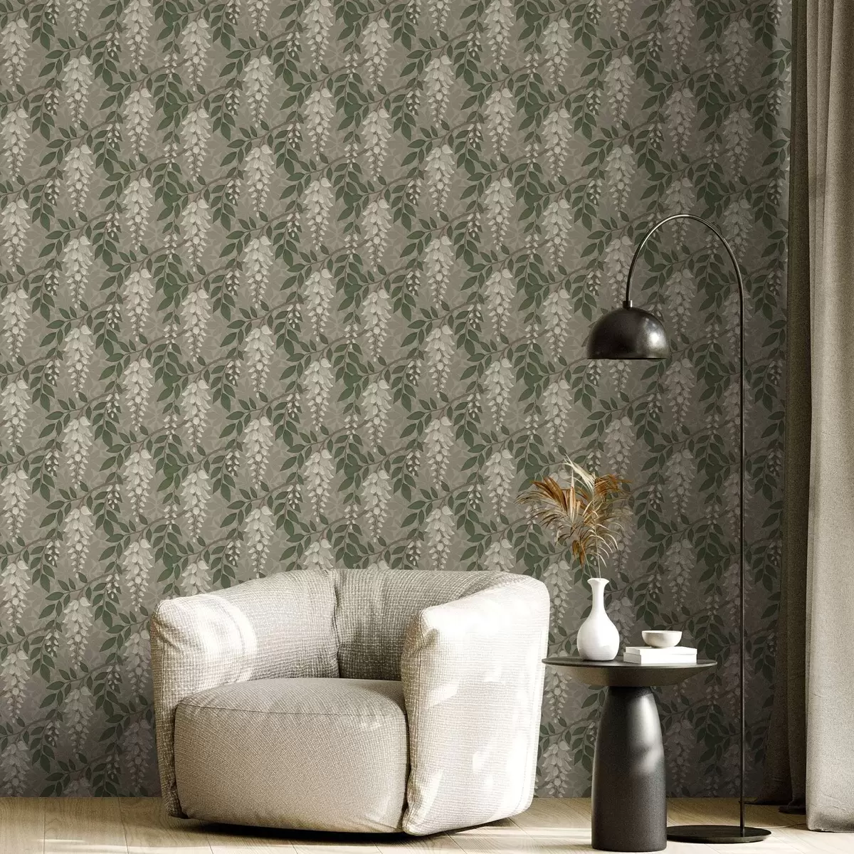 Tapetti Vaaleat wisteriat harmahtavan oliivinvärisellä taustalla, kasautuvat rypäleet Nr. a00694
