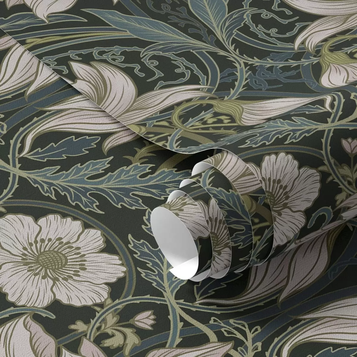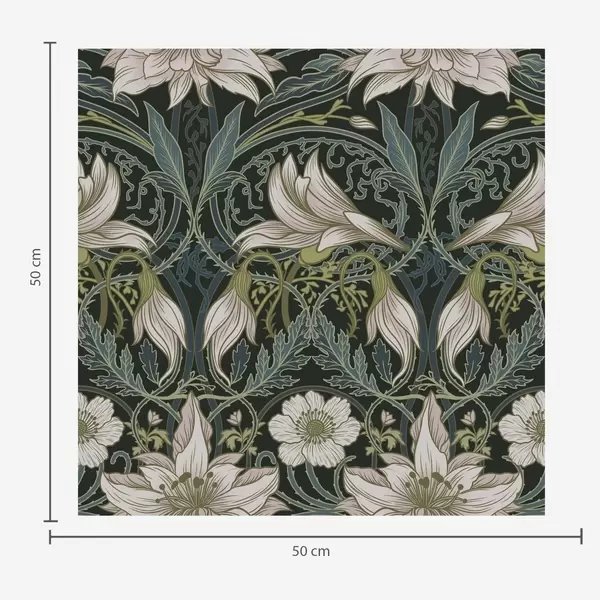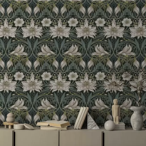 Tapetti Art Nouveau -kompositio, jossa liljoja tummalla taustalla Nr. a00696