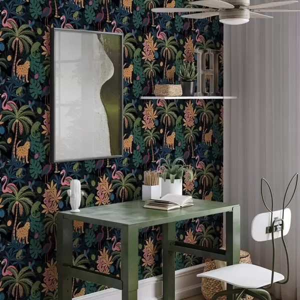 Tapetti Kirkkaat trooppiset eläimet lehtien keskellä tummalla taustalla Nr. a00701