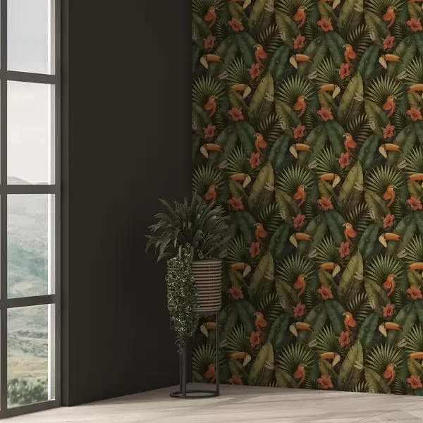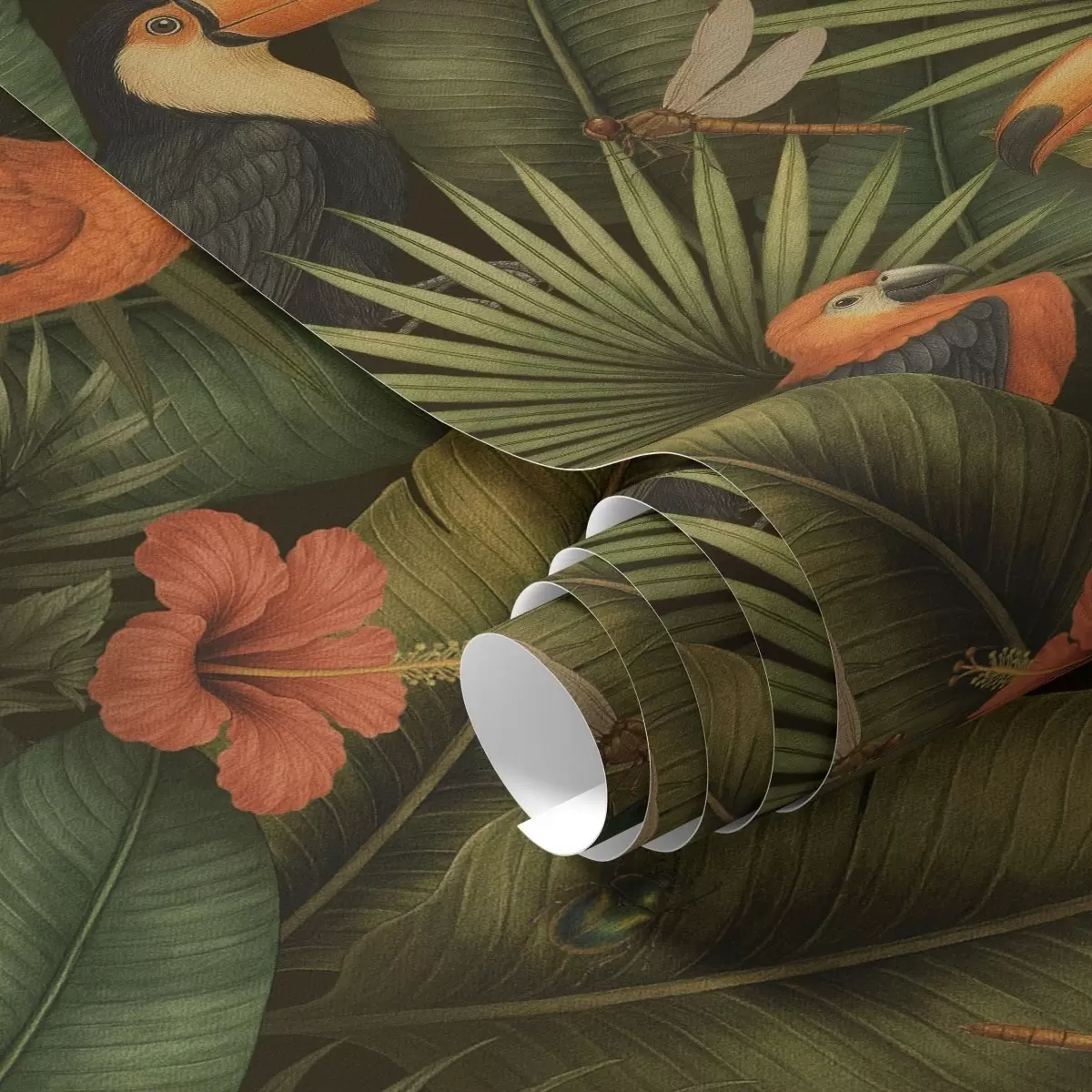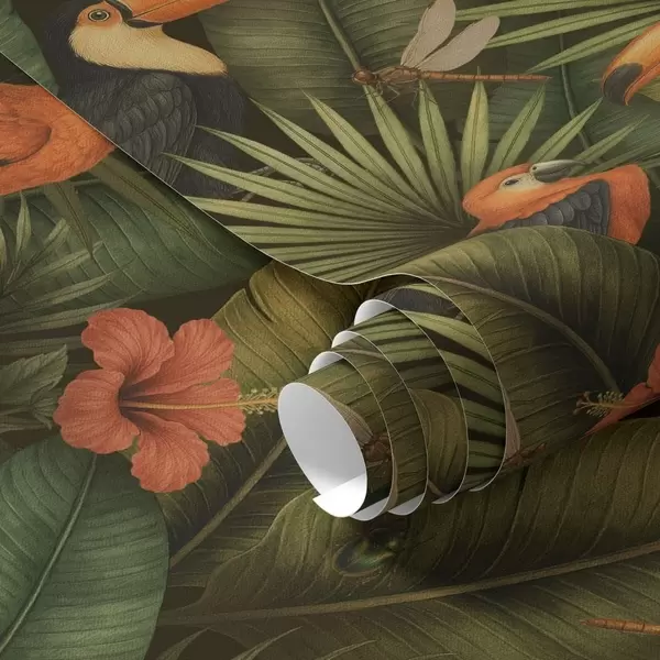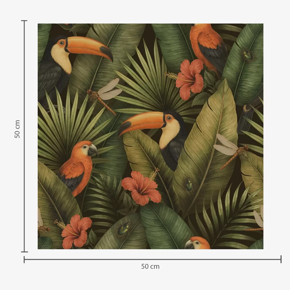 Tapetti Tukaanit ja papukaijat trooppisten lehtien ja kukkien keskellä Nr. a00702