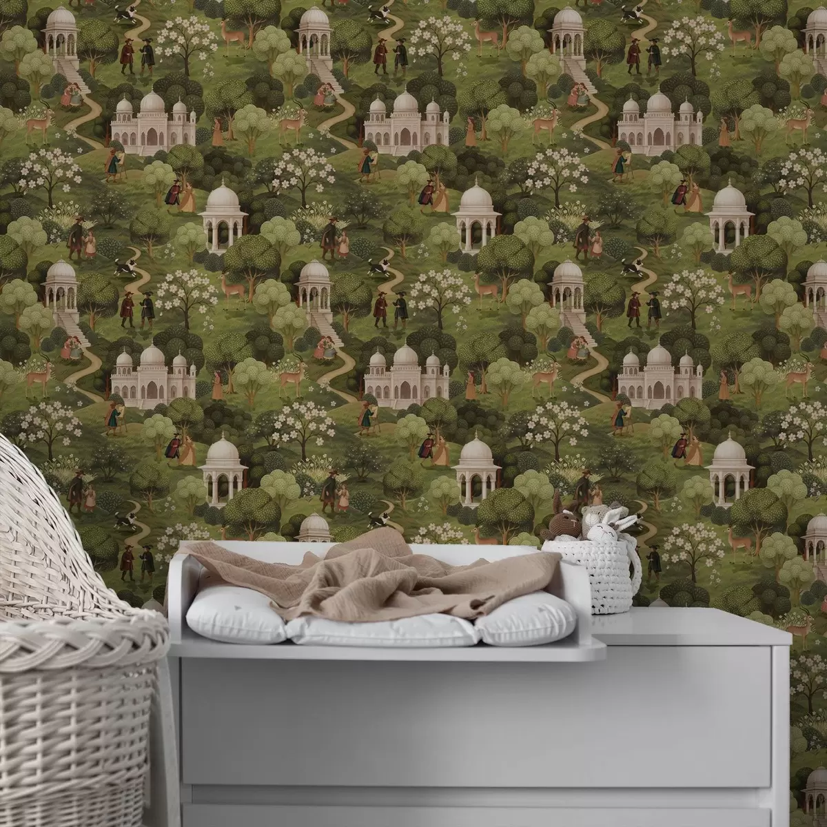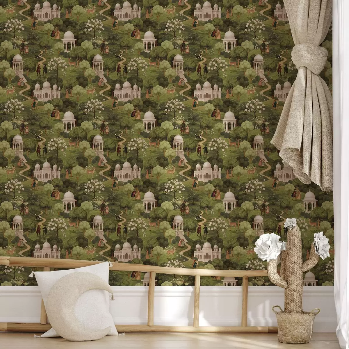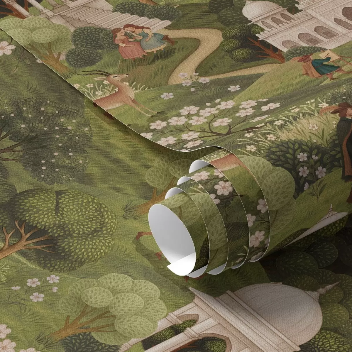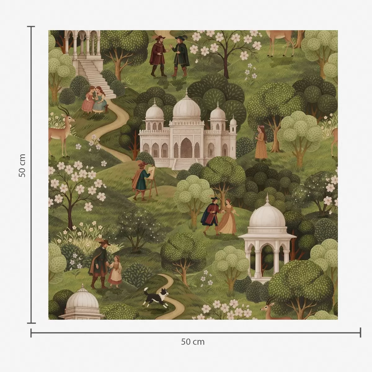 Tapetti Puisto, jossa on puita ja arkkitehtuuria maisematyylillä Nr. a00705