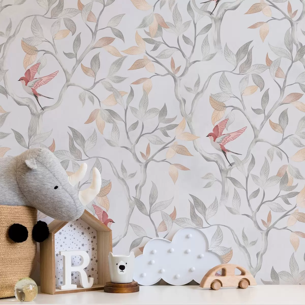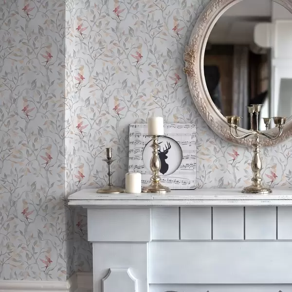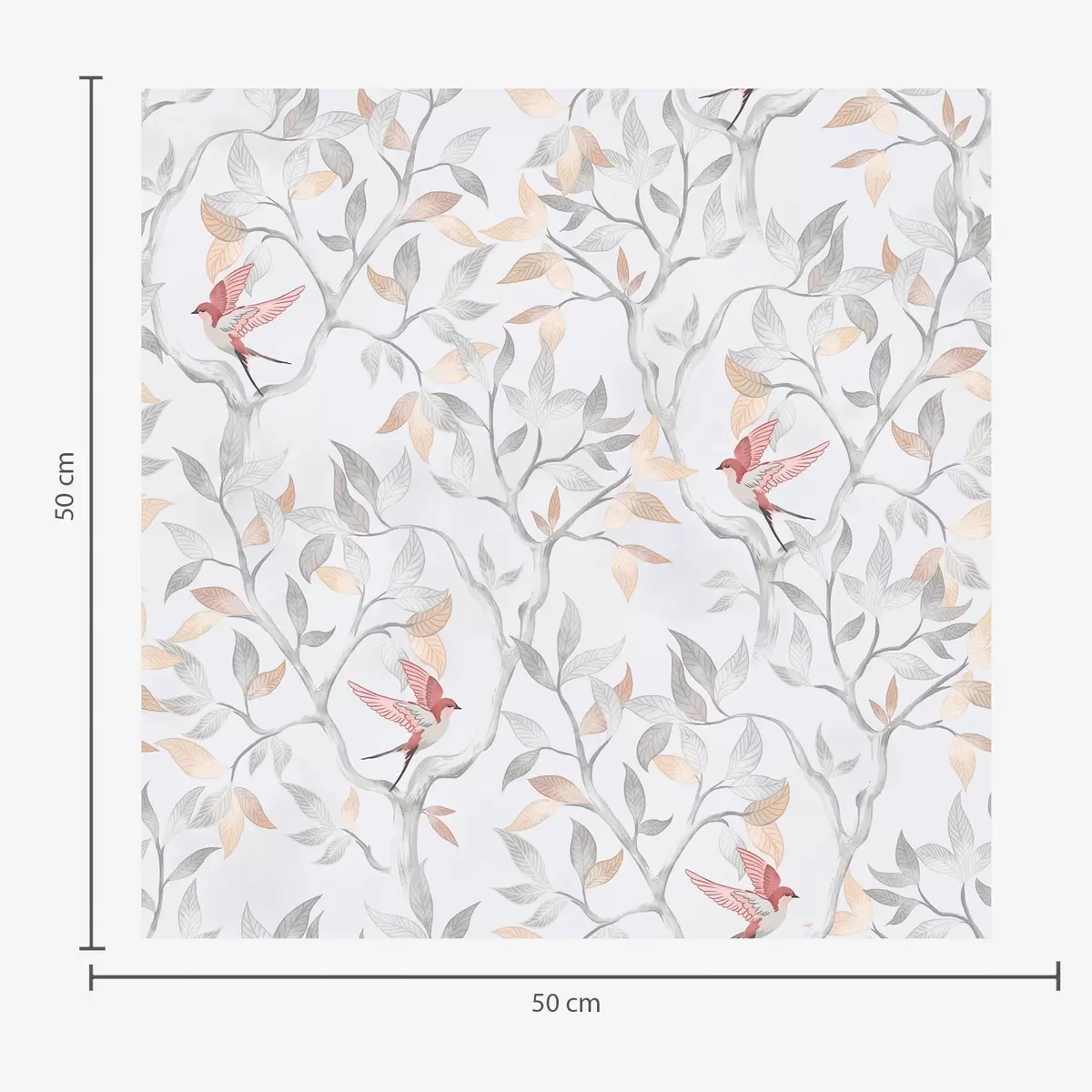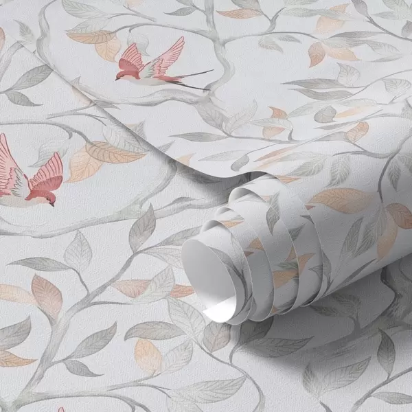 Tapetti Kevyet oksat, joissa on lehtiä ja lintuja persikan sävyissä Nr. a00716