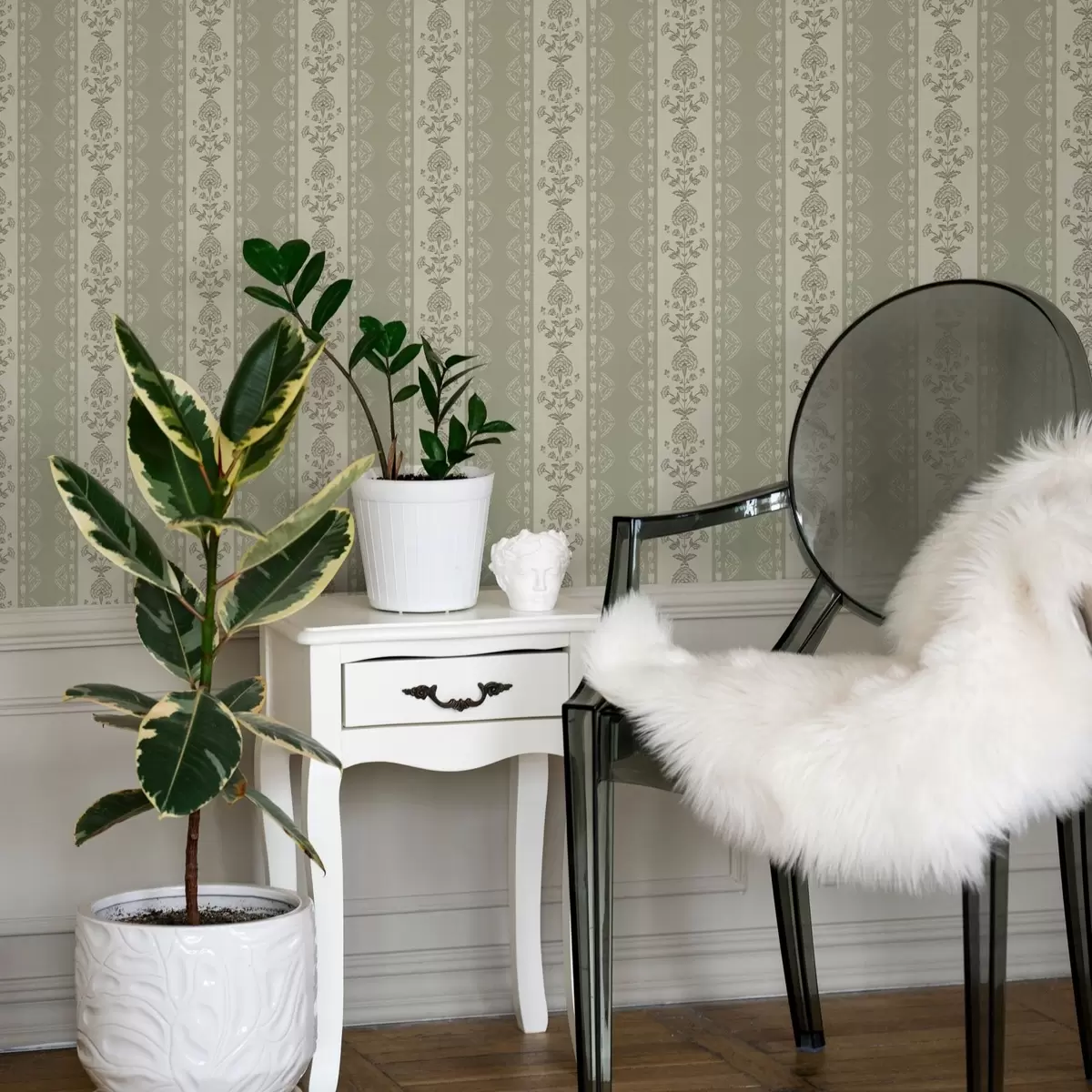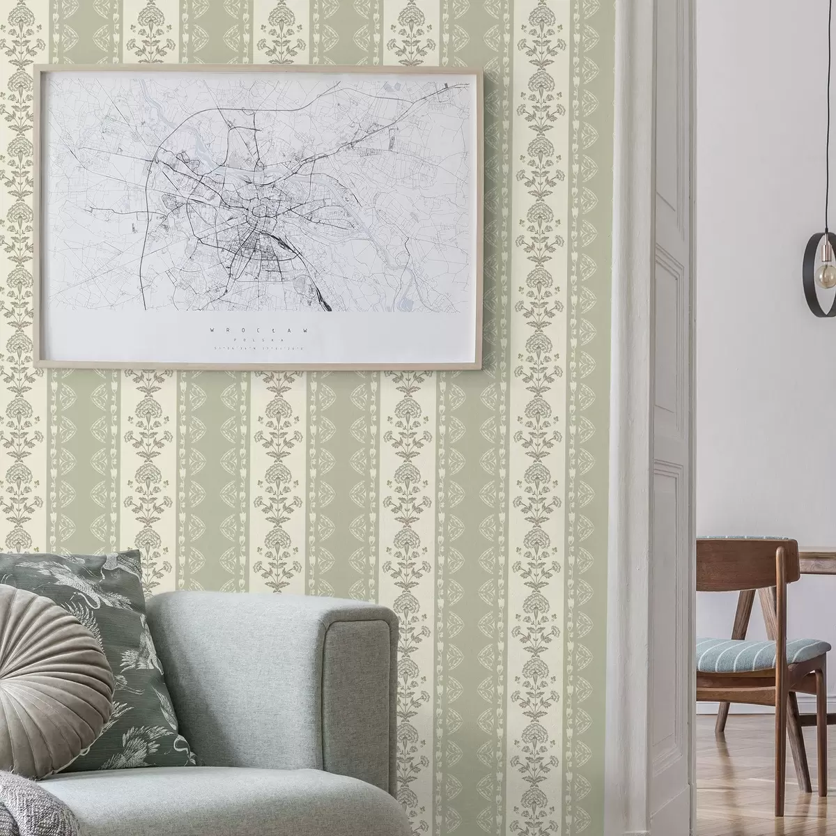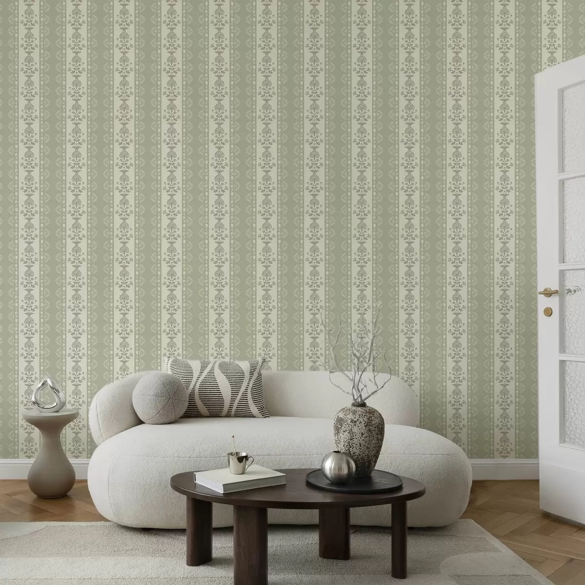 Tapetti Raidallinen koriste, jossa on salvia-sävyisiä kukkakuvioisia pylväitä Nr. a00719