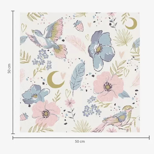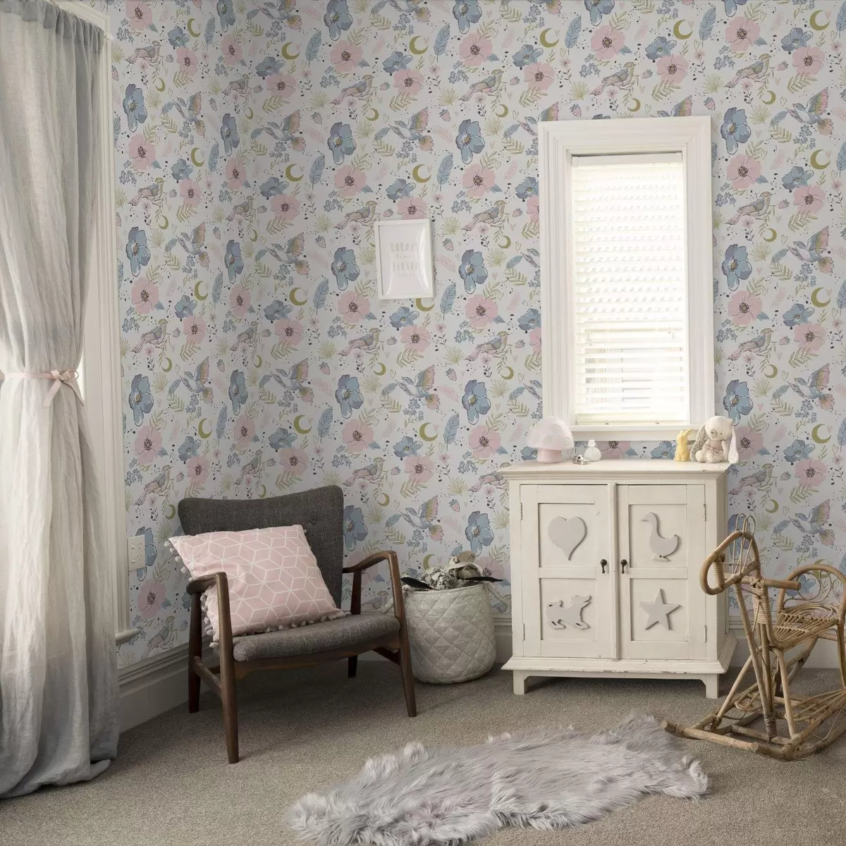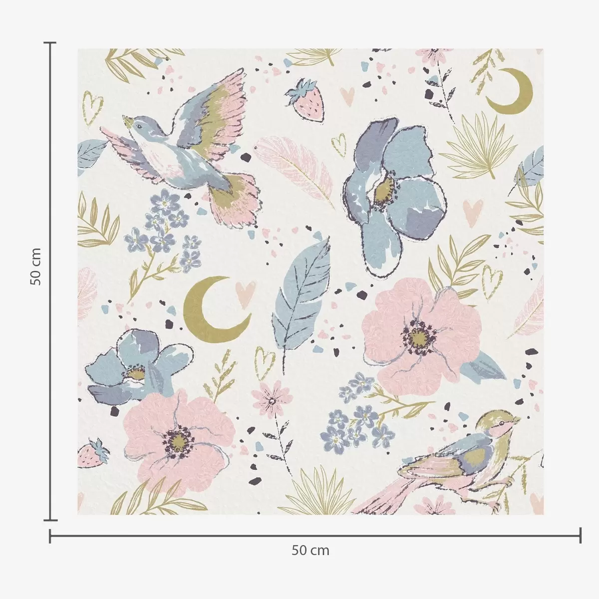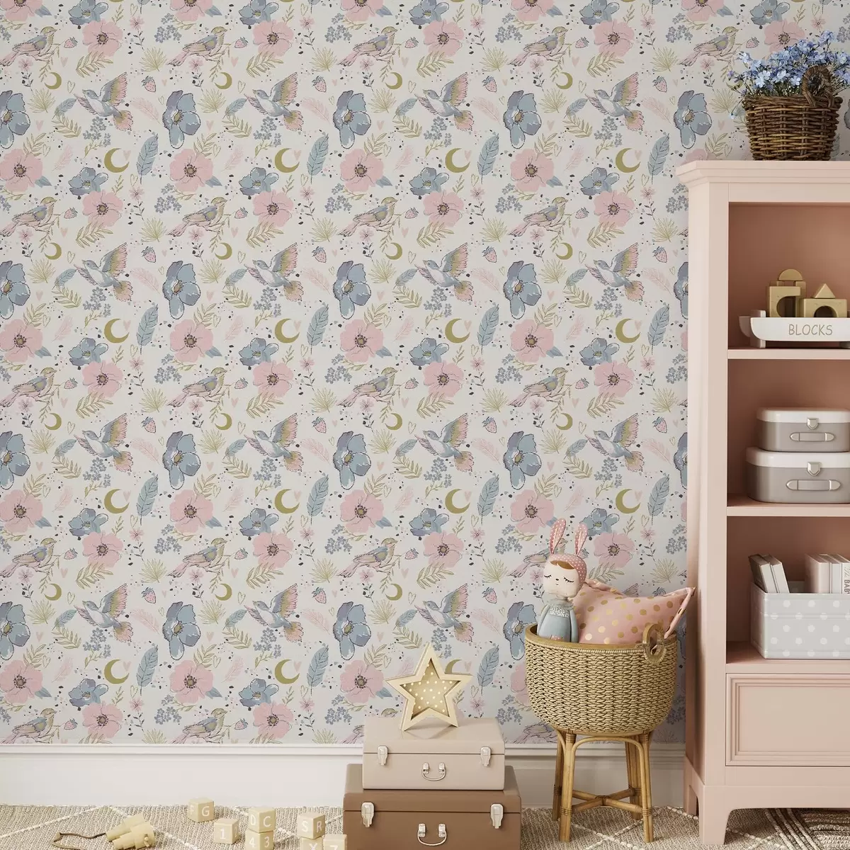 Tapetti Pastelliväriset linnut ja kukat sekä puolikuut valkoisella taustalla Nr. a00721