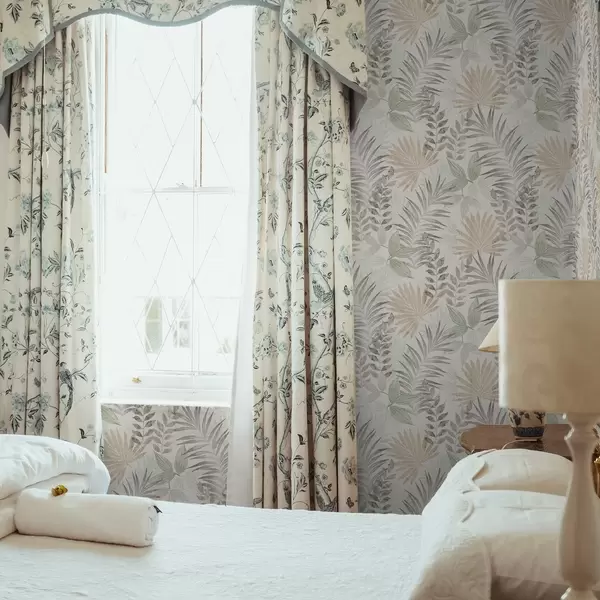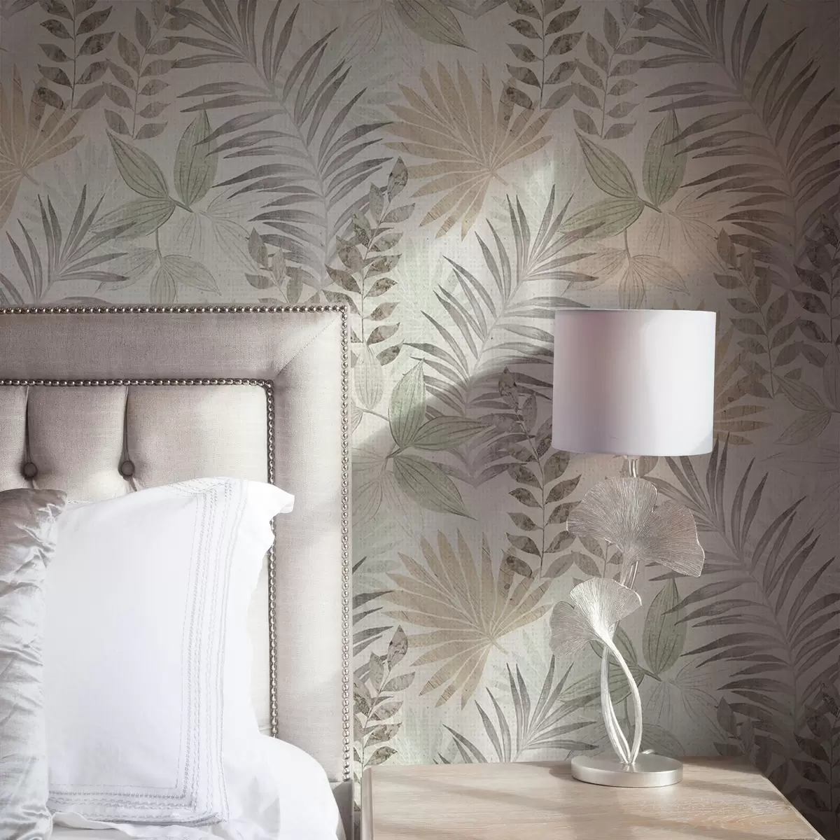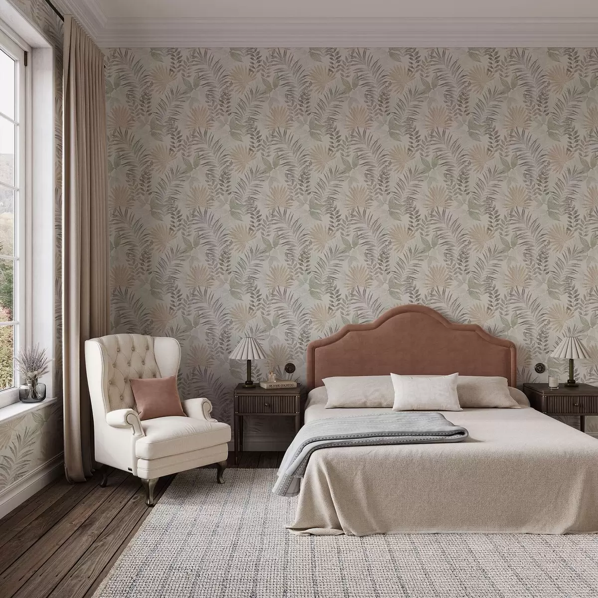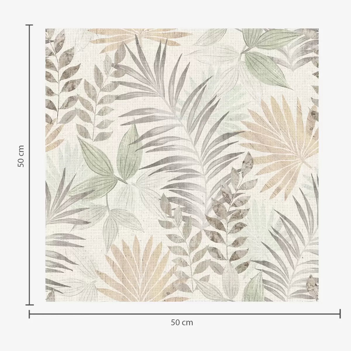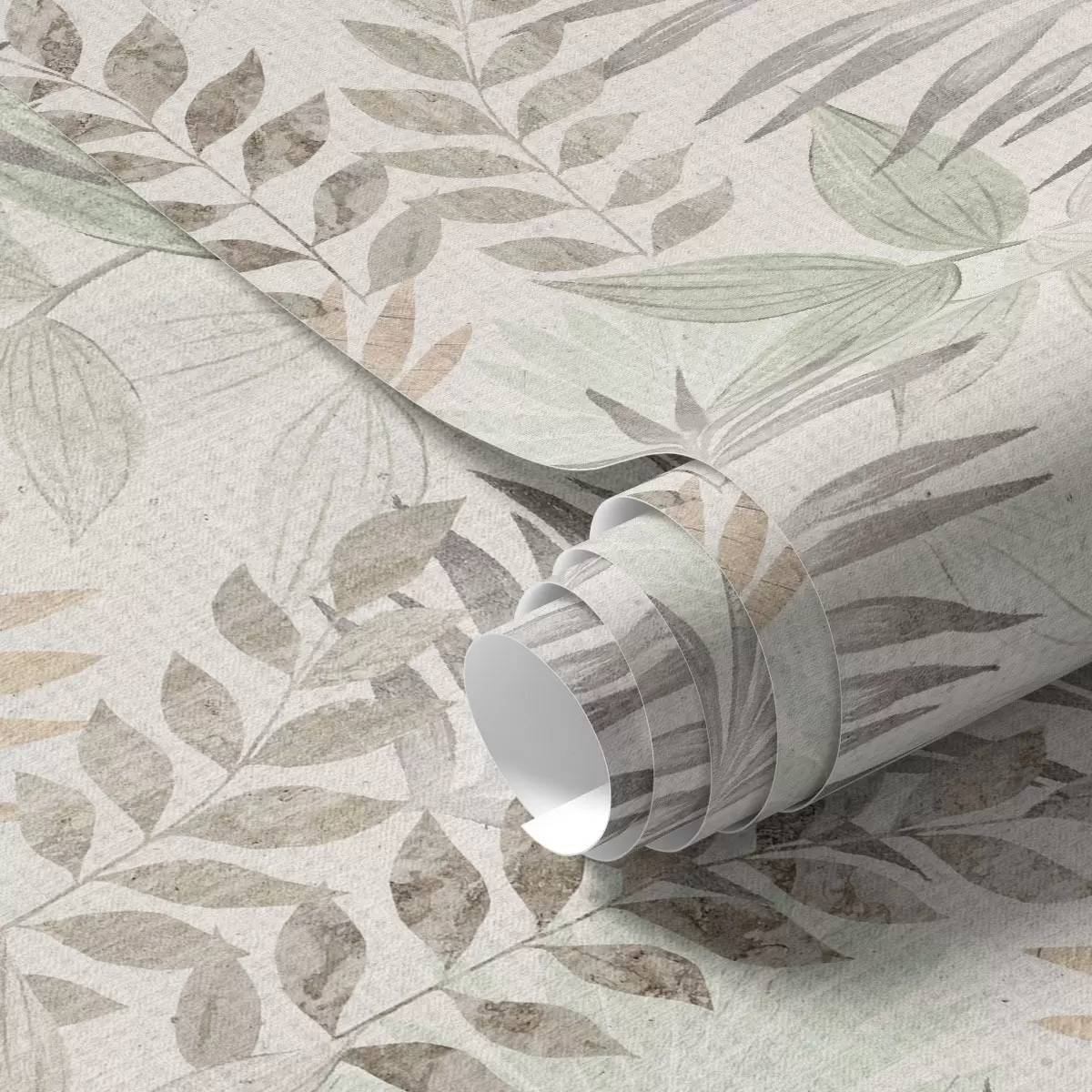 Tapetti Pastelliväriset trooppiset lehdet vaalealla taustalla, hienovarainen tekstuuri Nr. a00725