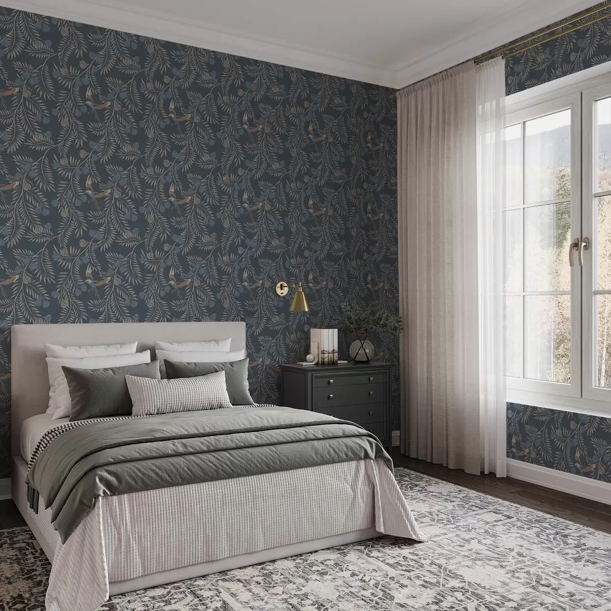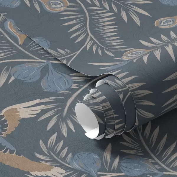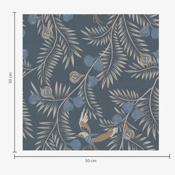 Tapetti Lintu sinisten hedelmien ja palmunlehtien keskellä, indigo Nr. a00726