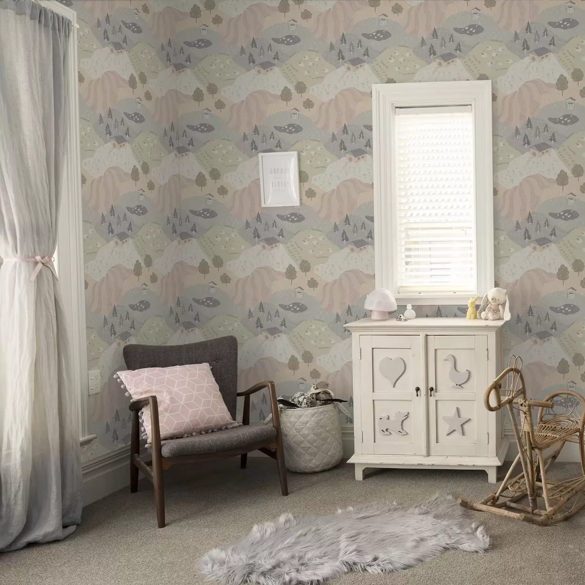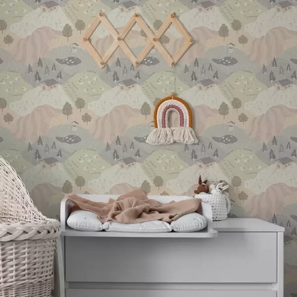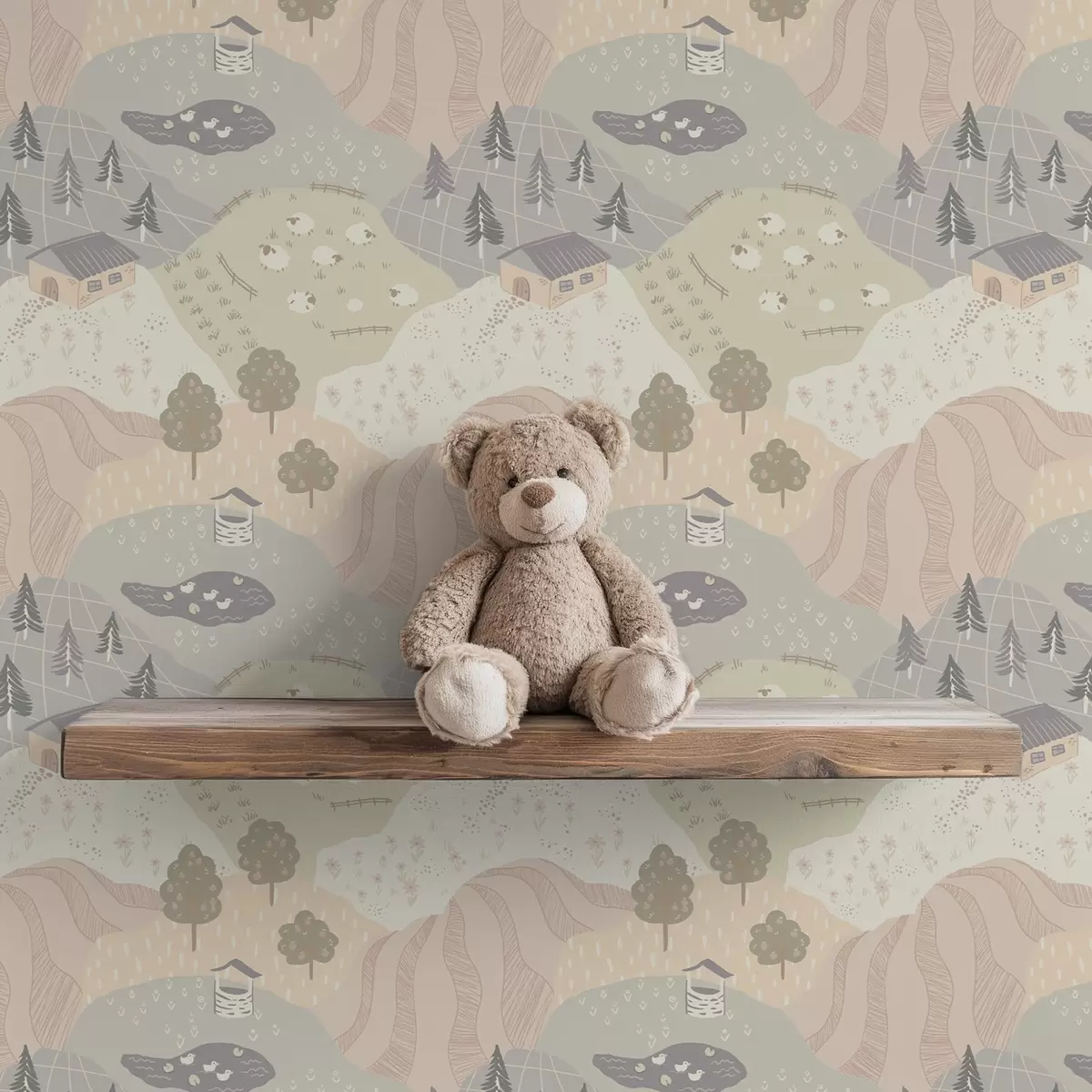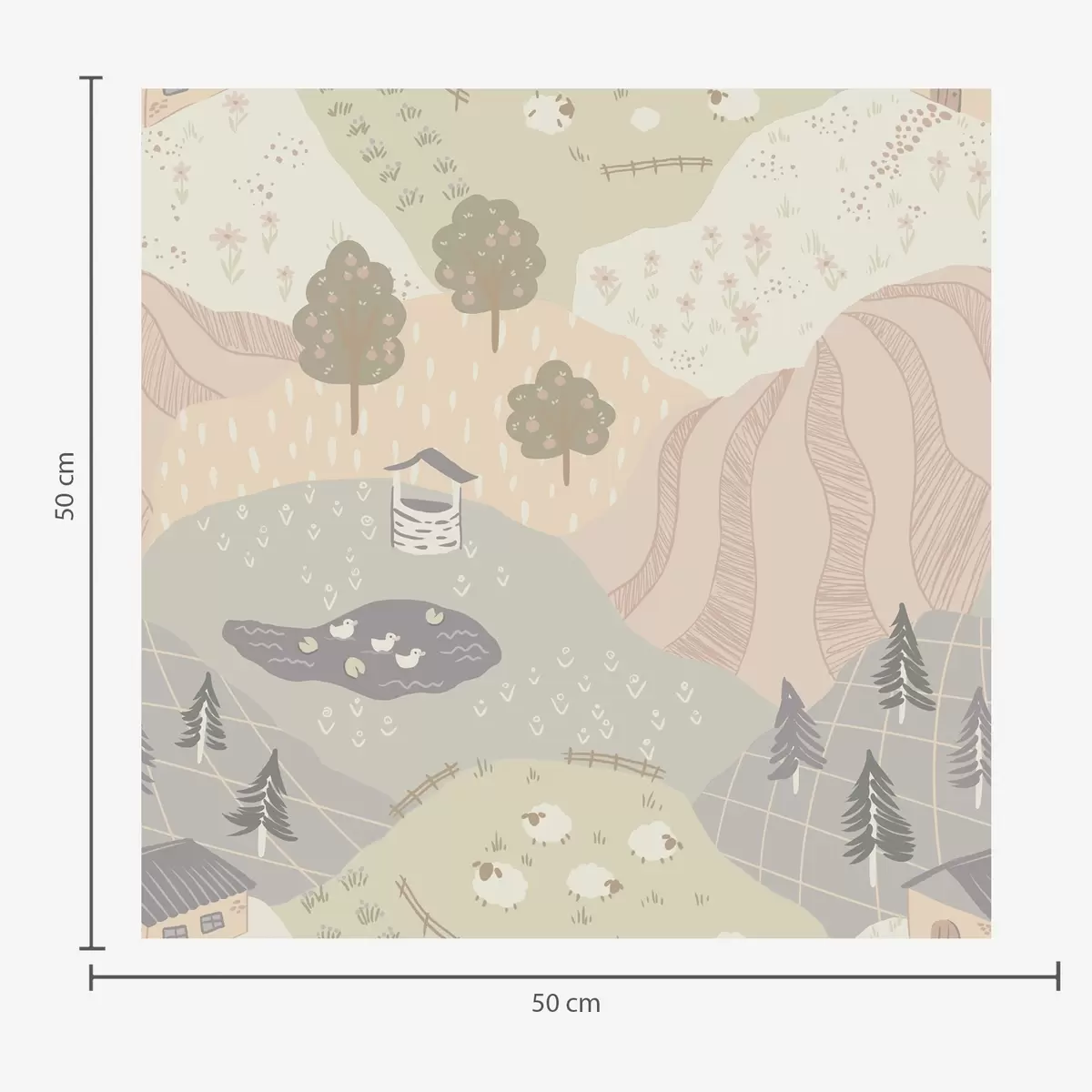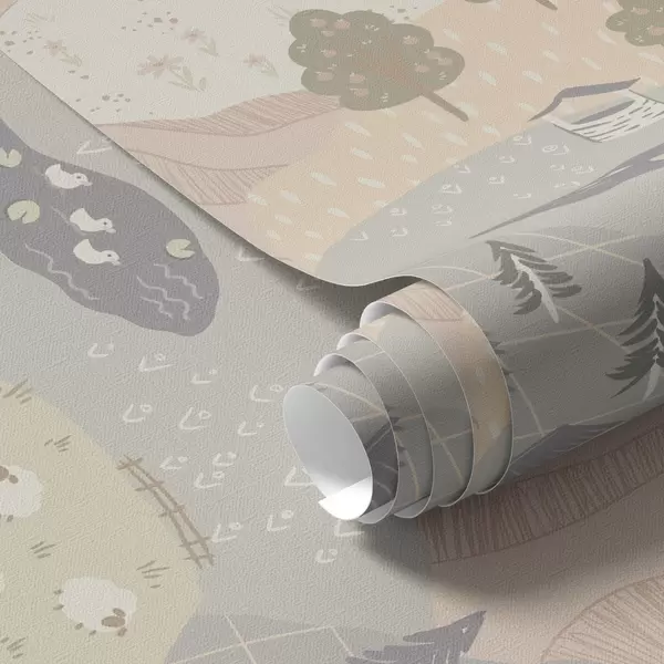 Tapetti Satumainen maaseutu puineen, hanhine ja lampaineen Nr. a00728