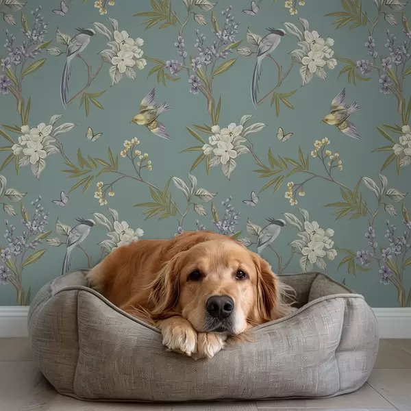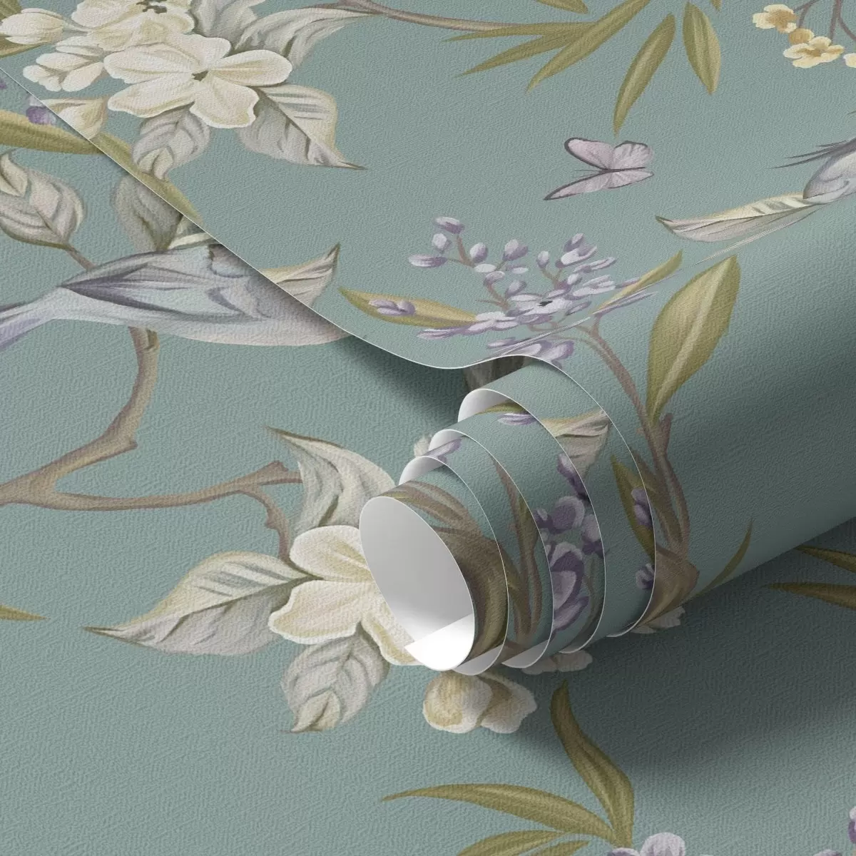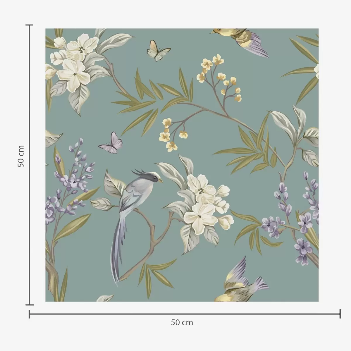 Tapetti Linnut, kukat ja perhoset sinisenharmaalla taustalla Nr. a00735