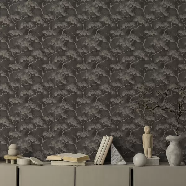 Tapetti Mäntyjen siluetit tummalla taustalla, sumuinen tekstuuri Nr. a00742