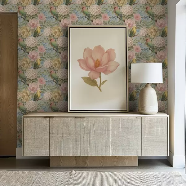 Tapetti Papukaijat pionien, hydrangeoiden ja magnolioiden keskellä Nr. a00747