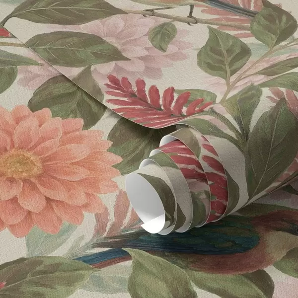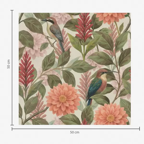 Tapetti Linnut kukkien ja lehtien keskellä lämpimissä sävyissä Nr. a00753