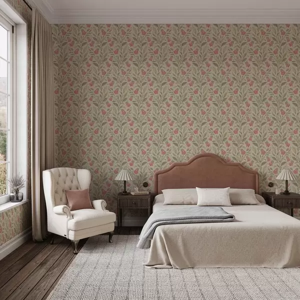 Tapetti Pienet kukat, joissa on kellomaisia, vaaleanpunaisen ja vihreän sävyisiä kukkia Nr. a00760