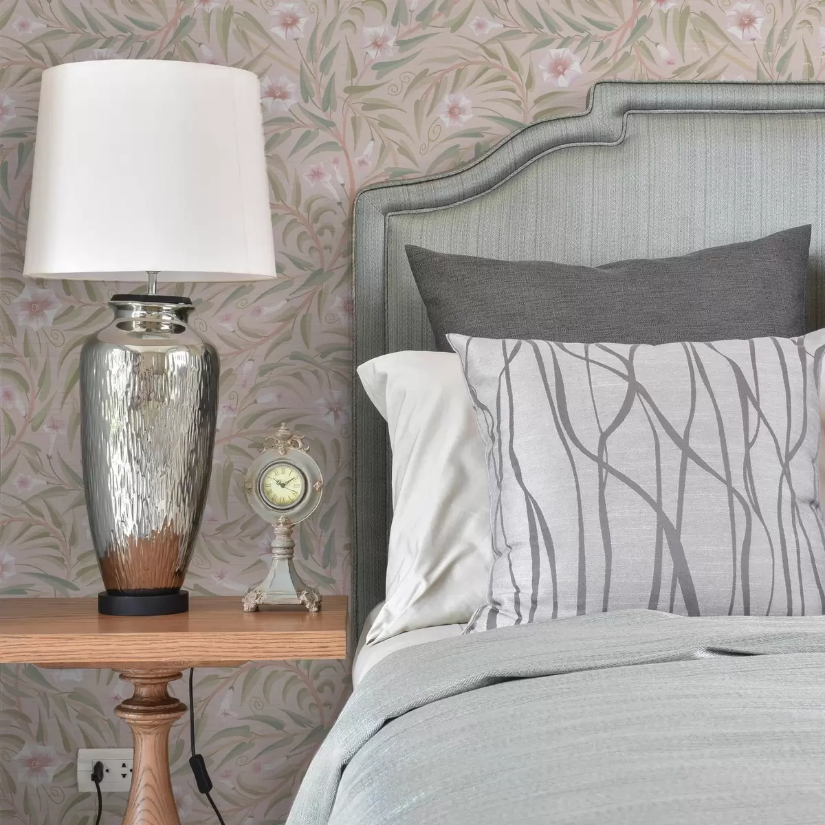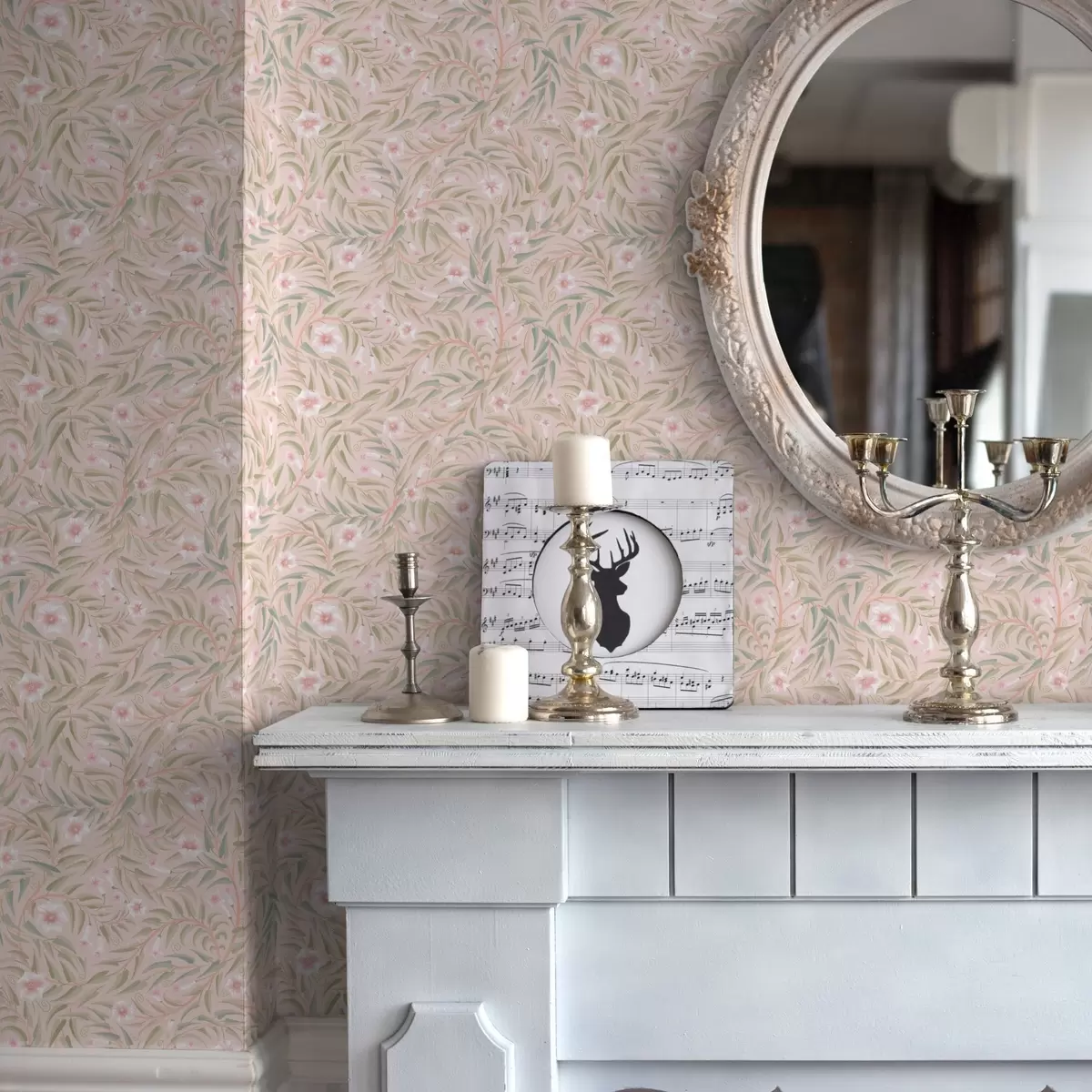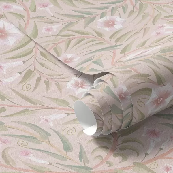 Tapetti Hienostuneet vaaleanpunaiset kukat ja pehmeät lehdet pastellisävyisellä taustalla Nr. a00788