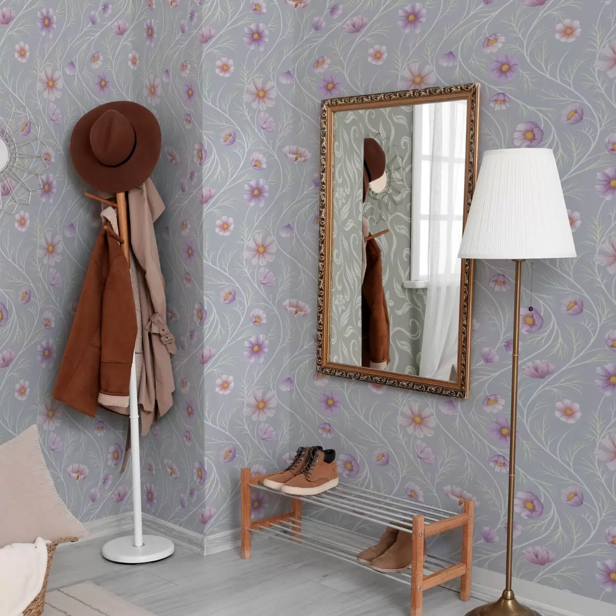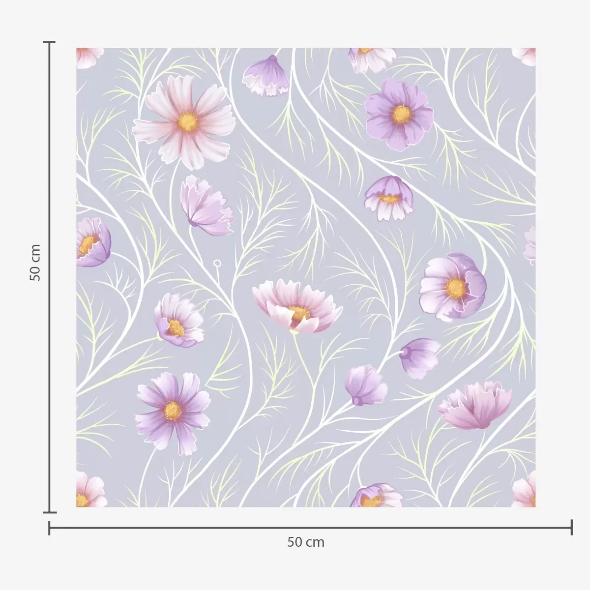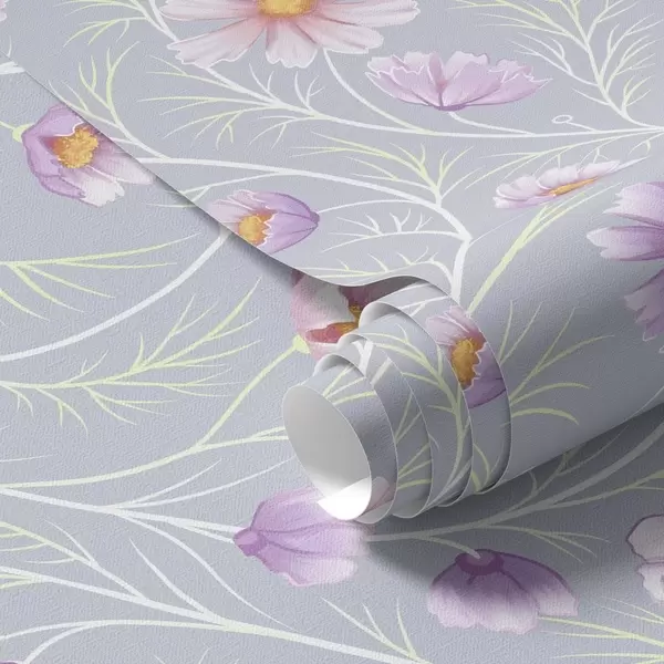 Tapetti Vaaleanpunaiset kosmoskukat ja hoikka varret harmaalla taustalla Nr. a00791