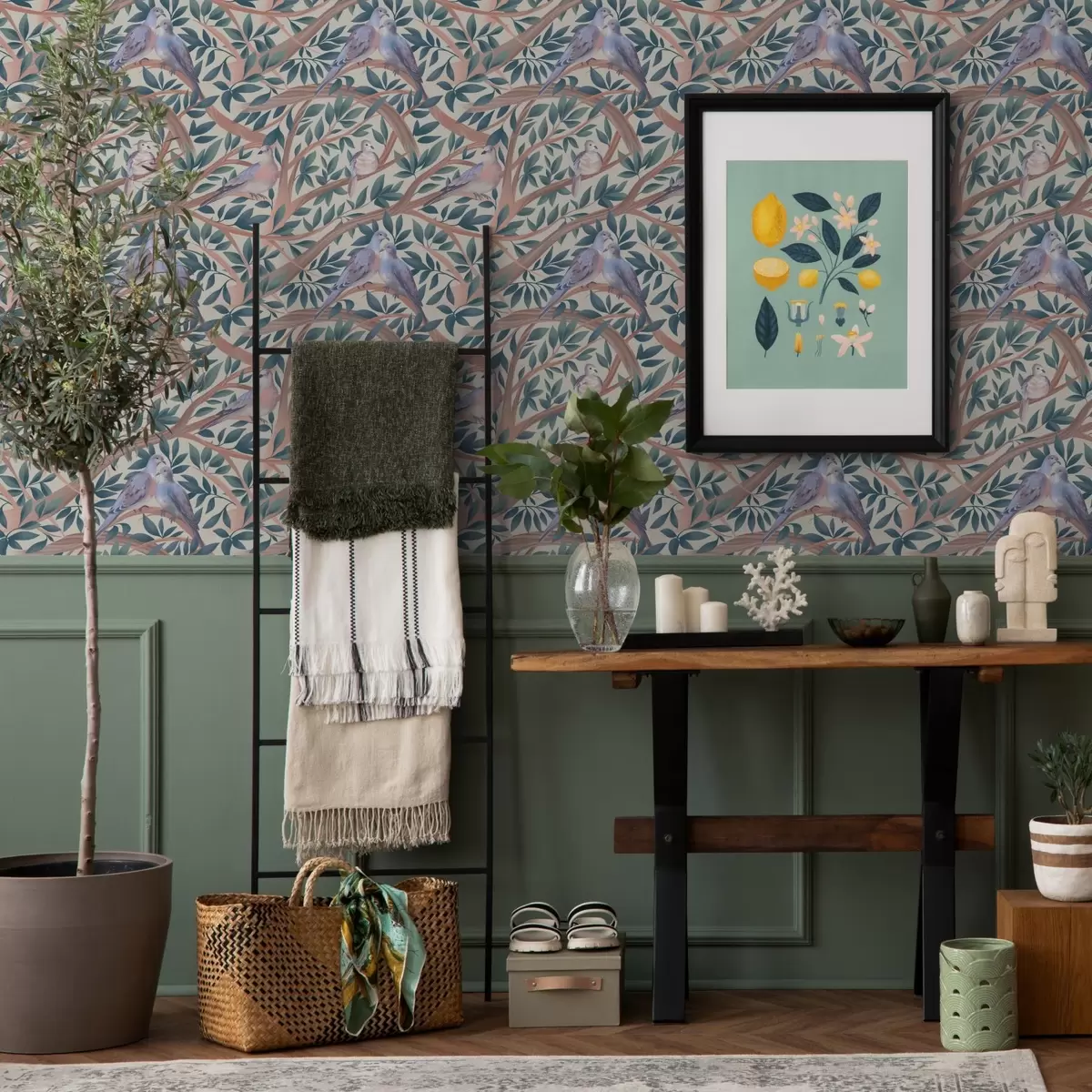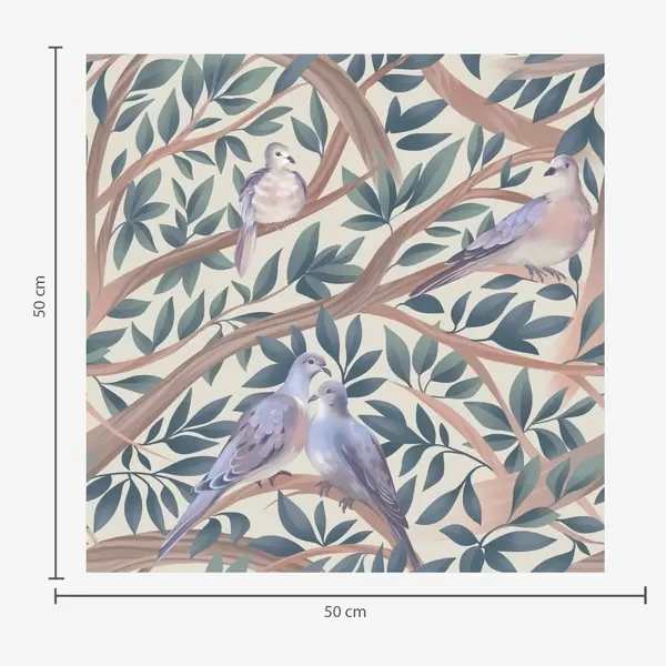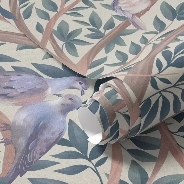 Tapetti Kyyhkyset oksien ja lehtien keskellä pehmeässä pastellisävyisessä paletissa Nr. a00796