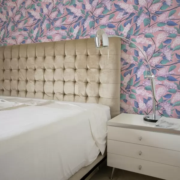 Tapetti Hienostuneet lila kukat vaaleanpunaisella taustalla, keväinen tunnelma Nr. a00797
