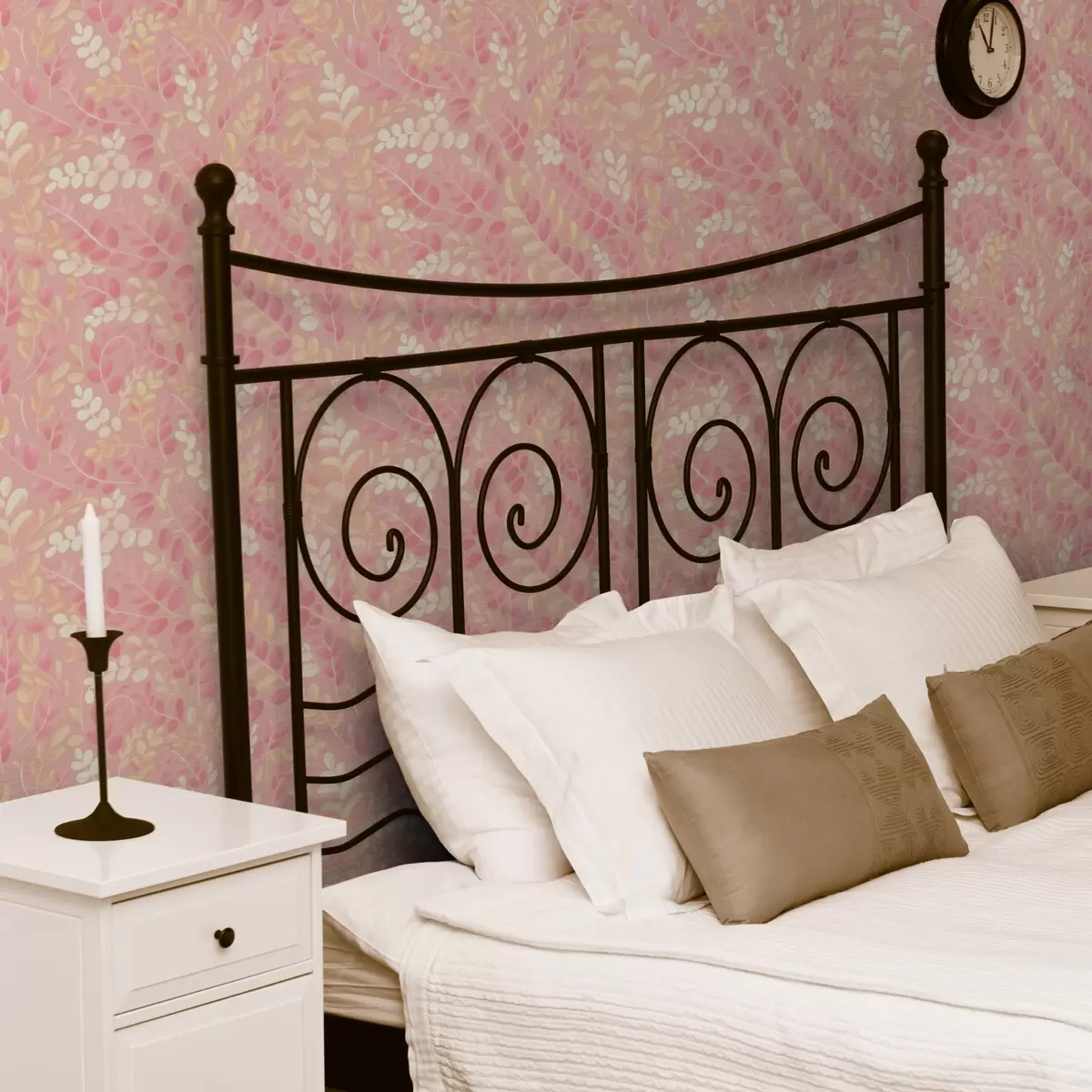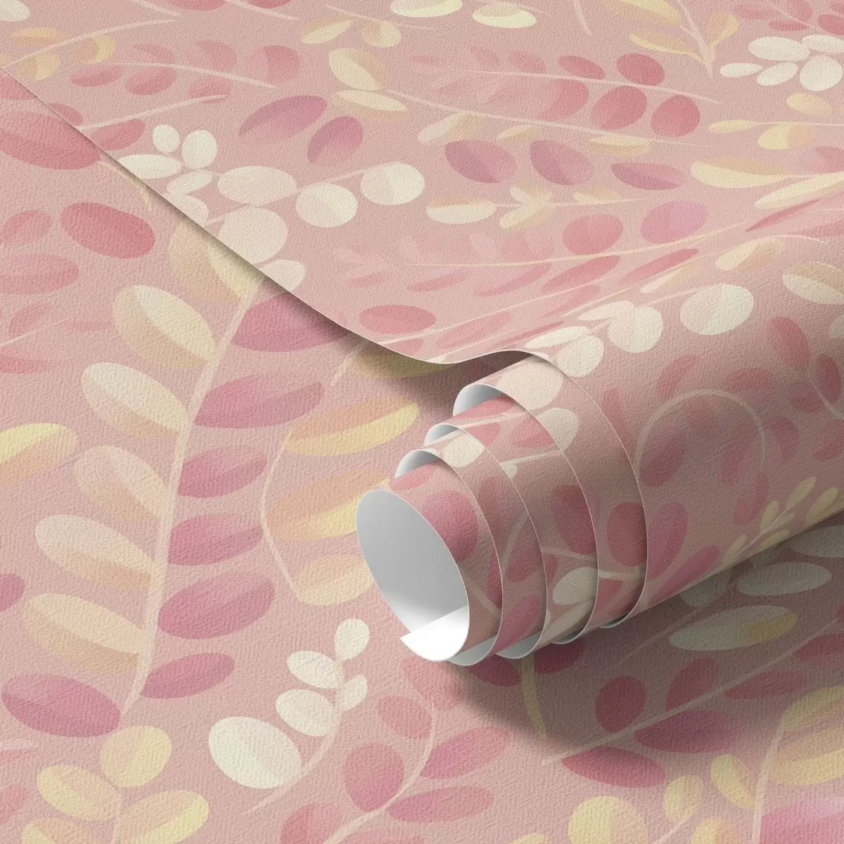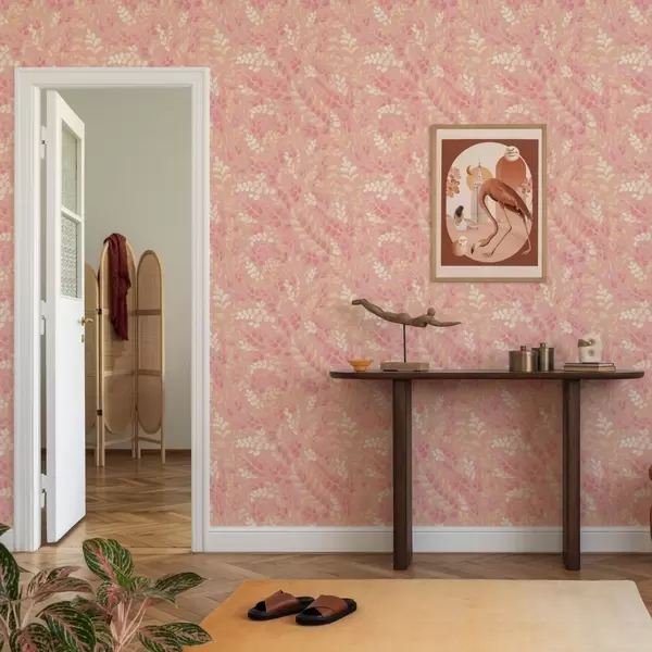 Tapetti Hienostunut vaaleanpunainen-persikanvärinen lehtien väri, jossa on pehmeä värin hohto Nr. a00799