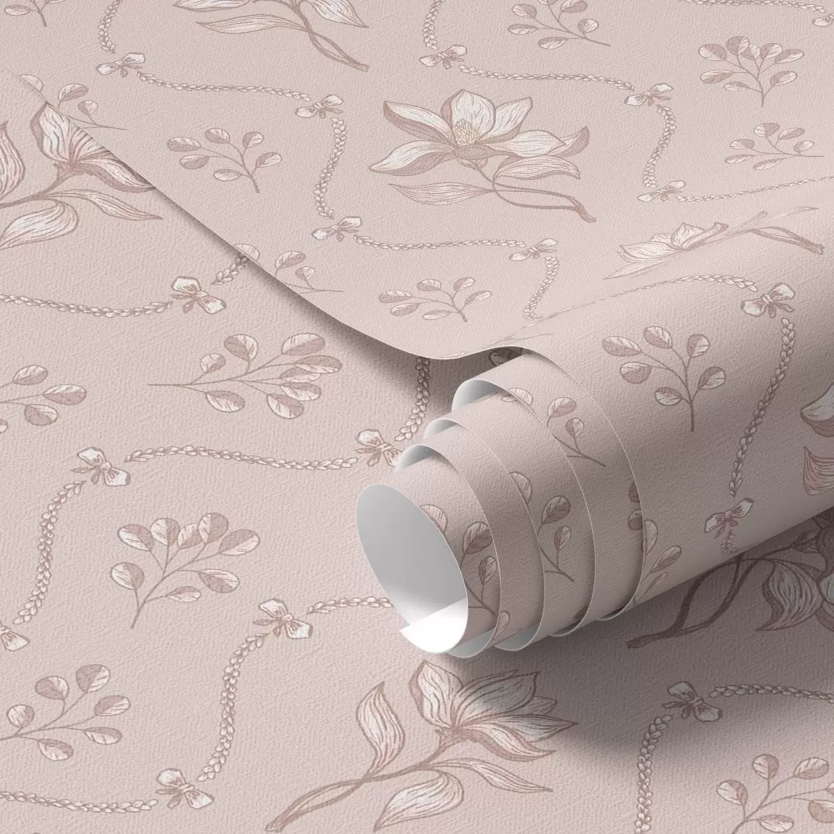 Tapetti Pienet kukat ja nauhat pehmeissä vaaleanpunaisissa ja beigeissä sävyissä Nr. a00808