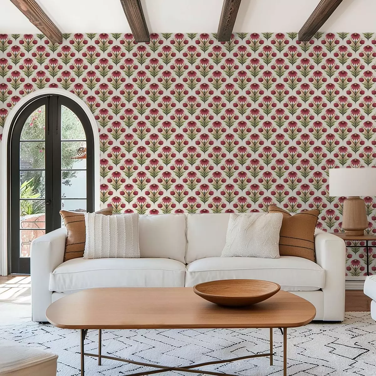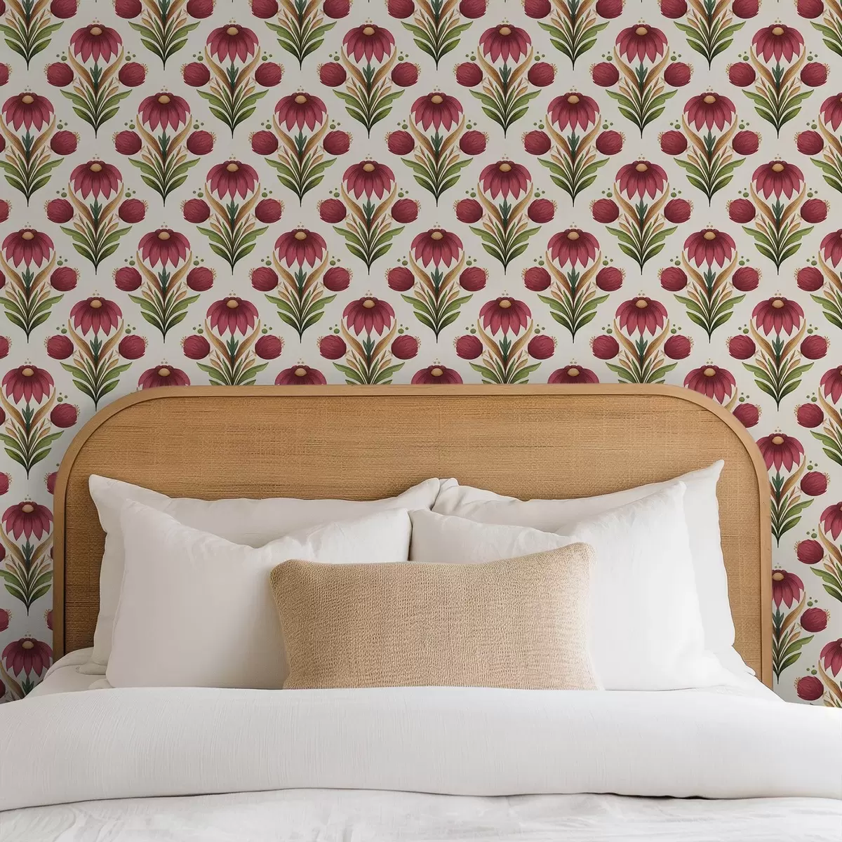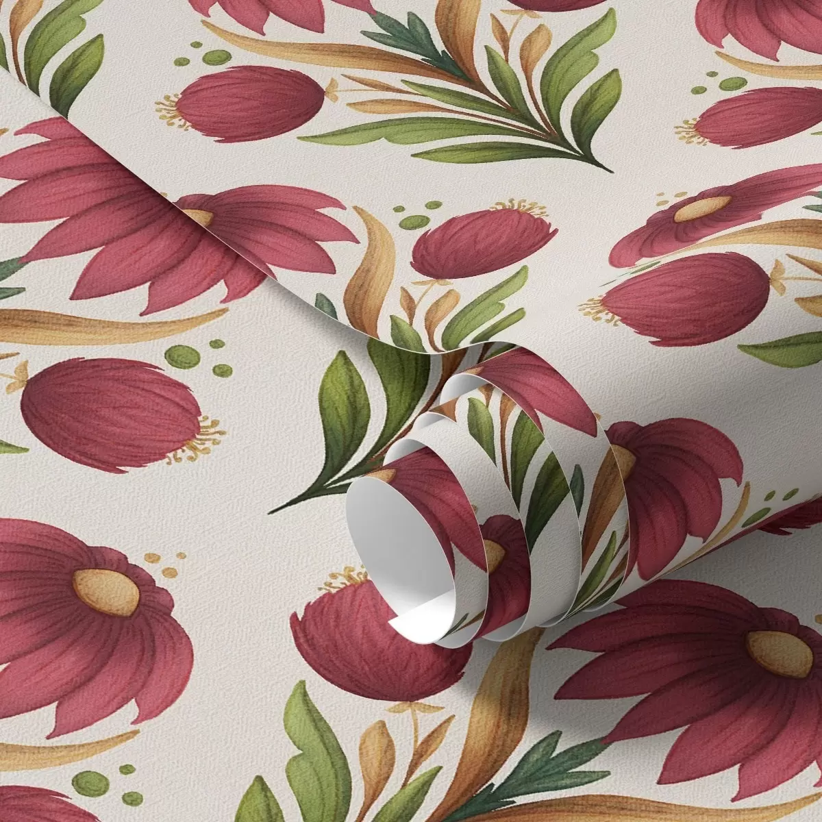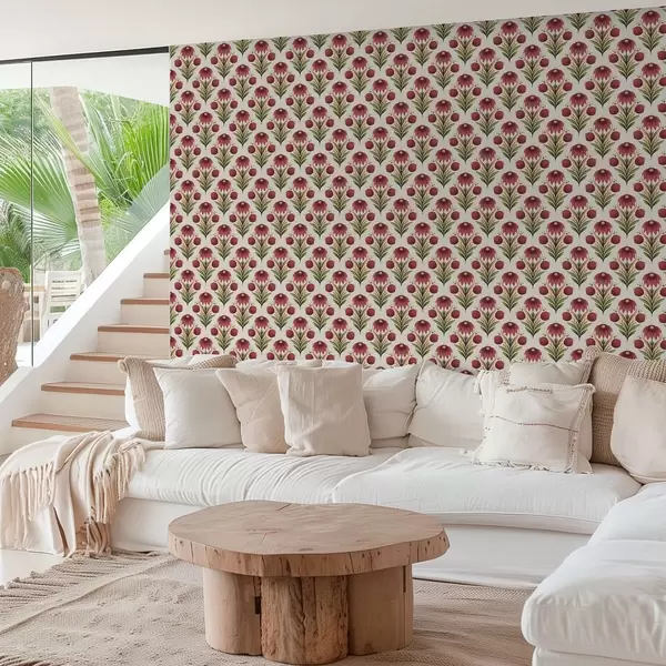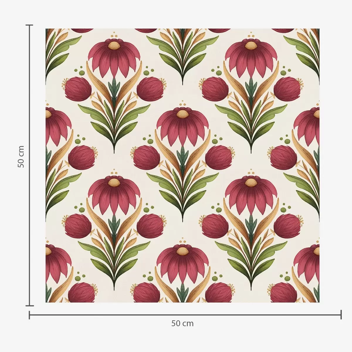 Tapetti Symmetrinen kukka-koriste rikkaissa punaisen ja vihreän sävyissä Nr. a00812v4