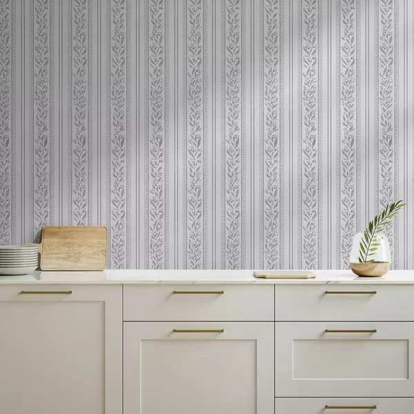 Tapetti Raidat, pitsiä ja oksia viileän valkoisella pohjalla Nr. a00814v1