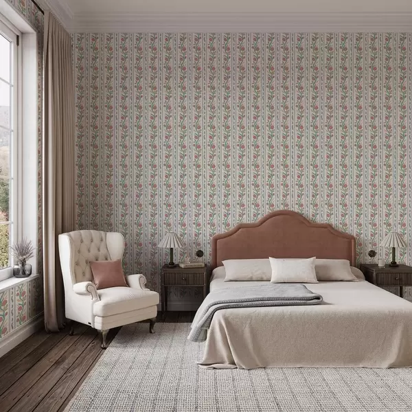 Tapetti Pystysuuntaiset raidat, korallikukkia ja turkooseja lehtiä Nr. a00816