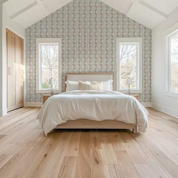 Tapetti Raidat, joissa on korallinpunaisia silmuja vaalean kermanvärisellä taustalla Nr. a00816v1