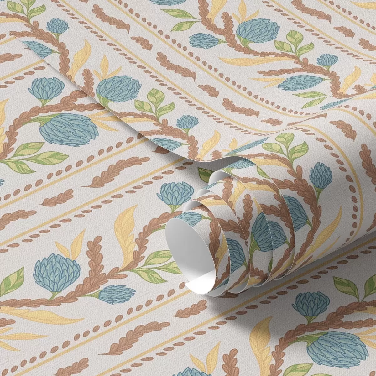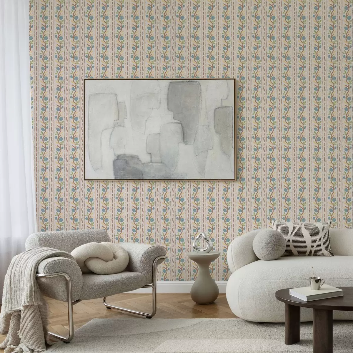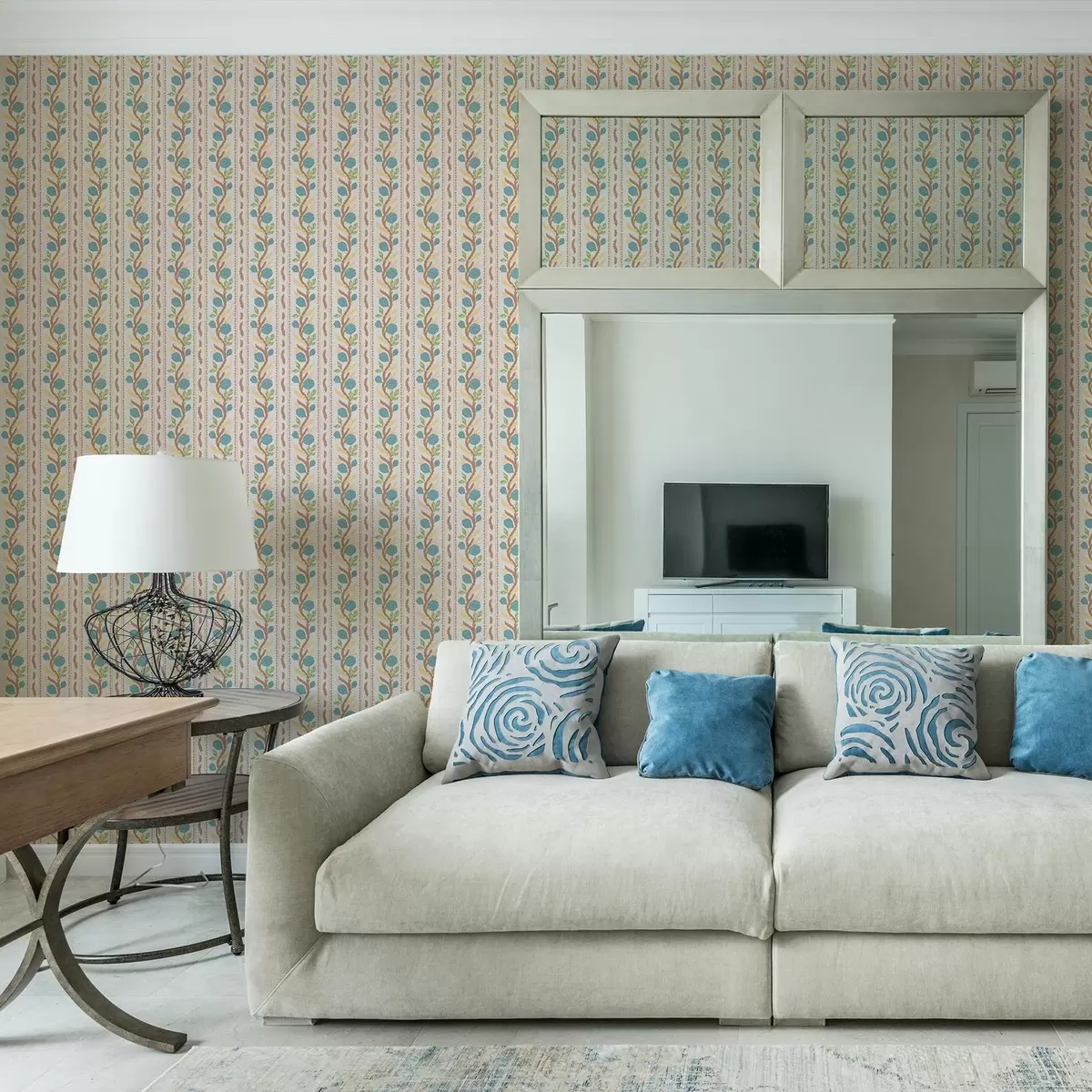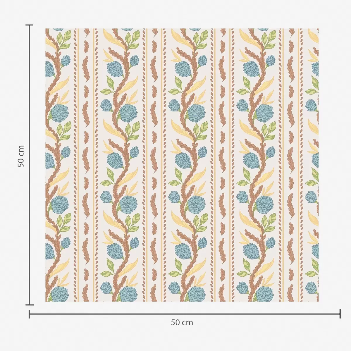 Tapetti Pystysuuntaiset kukkakuvioiset raidat, joissa on sinisiä kukkia lämpimällä pohjalla Nr. a00816v3