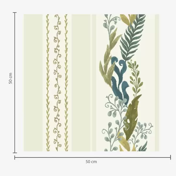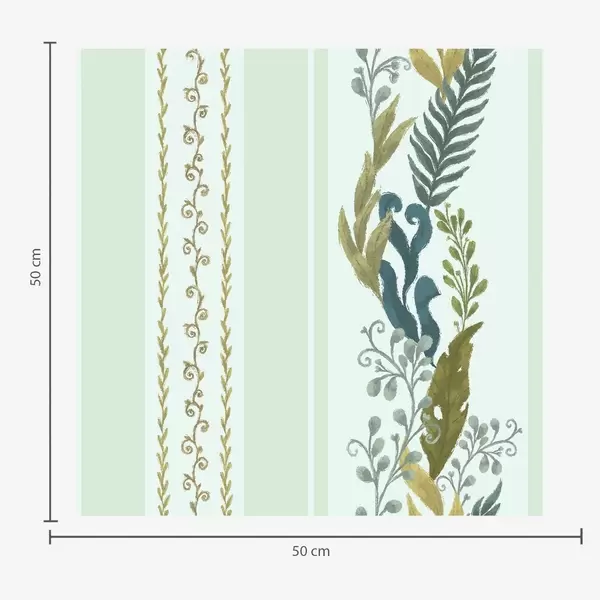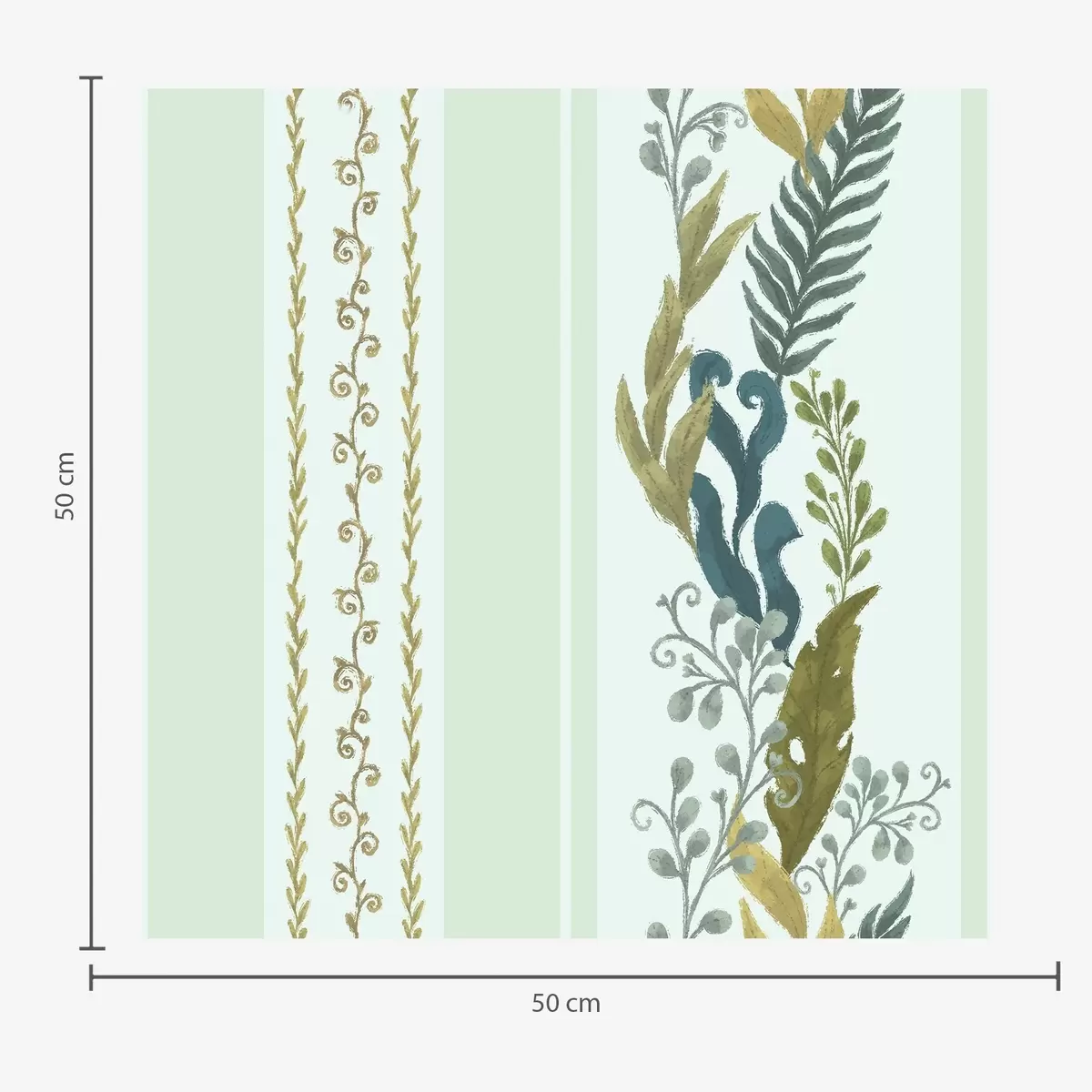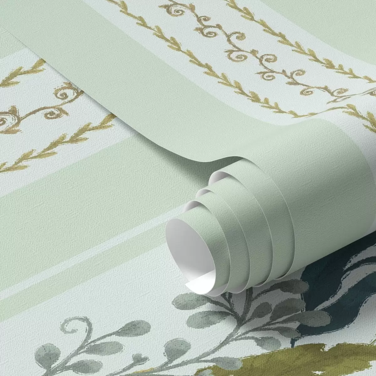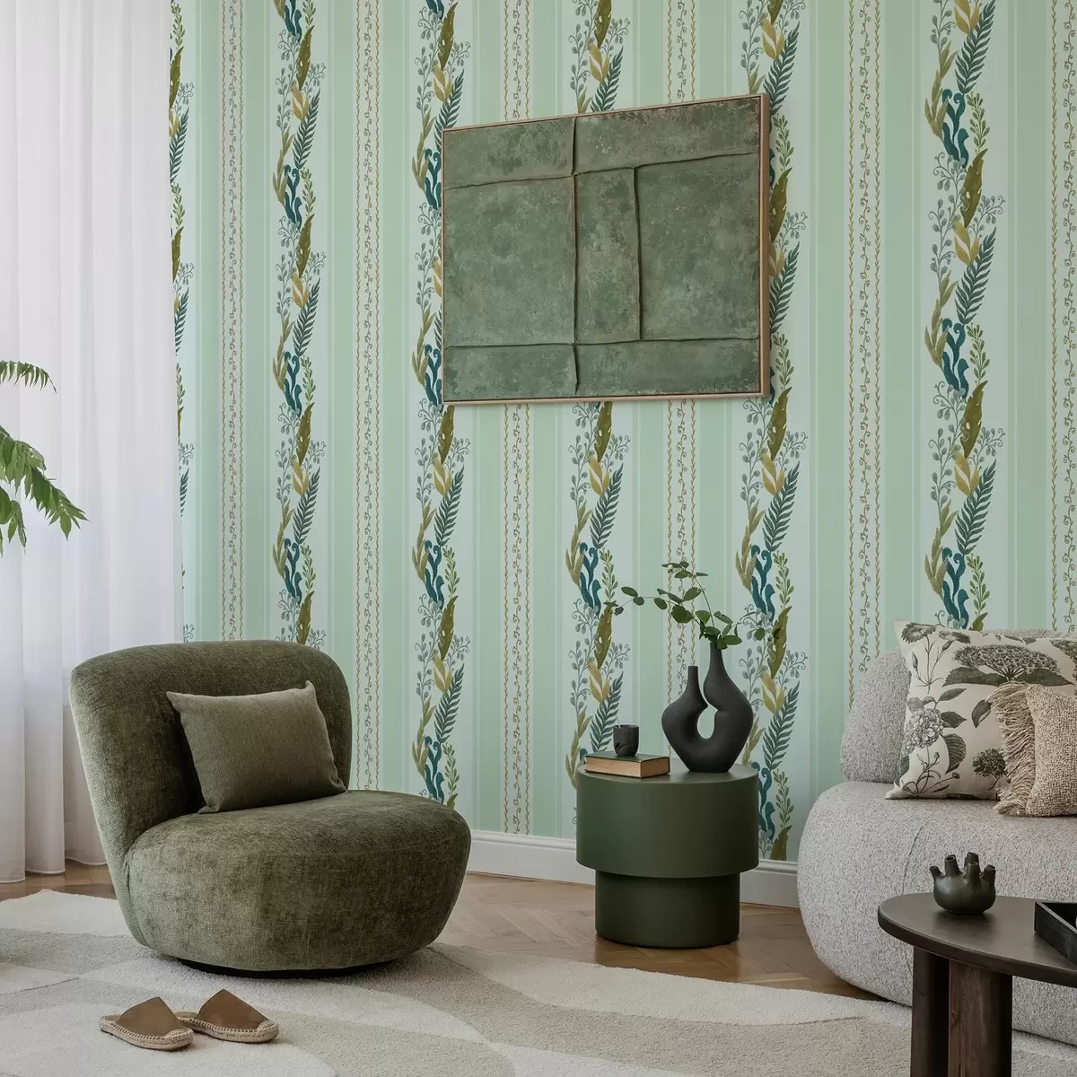 Tapetti Leveät raidat ja maalaukselliset oksat pehmeällä mintunvärisellä pohjalla Nr. a00825v1