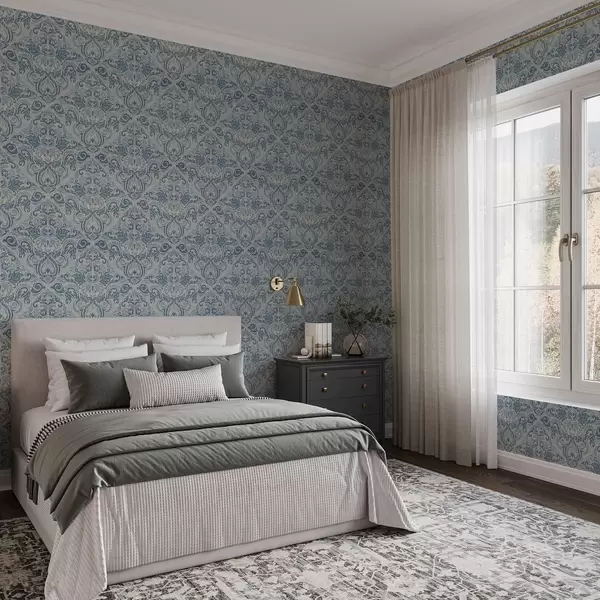 Tapetti Klassinen damaskikuvio, siniset motiivit kermanvärisellä pohjalla Nr. a00826v1