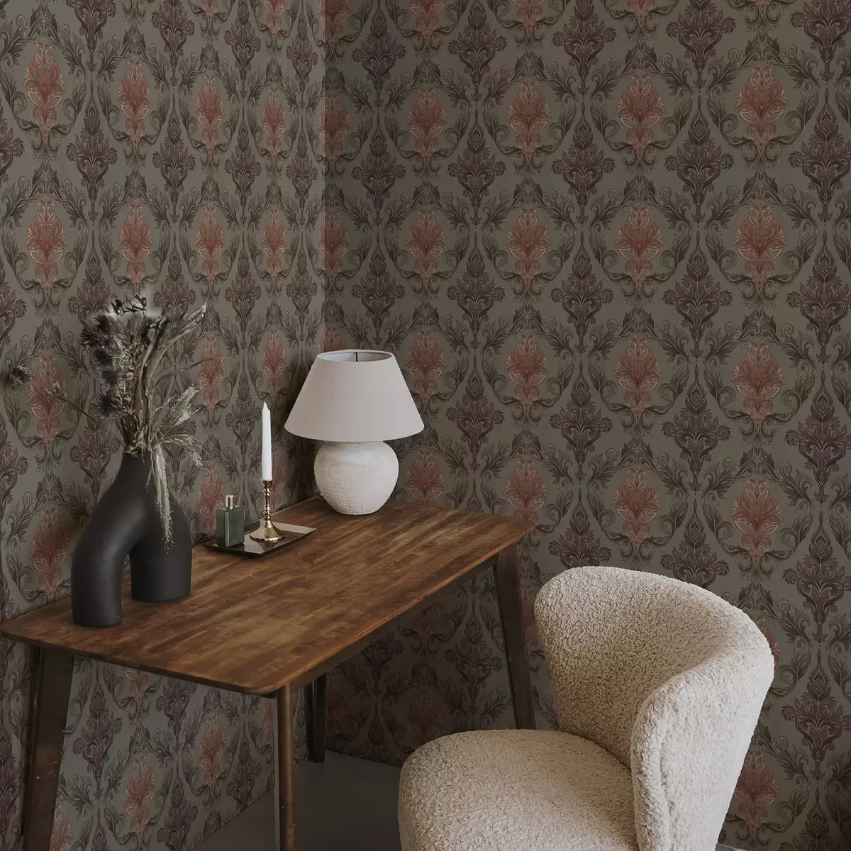 Tapetti Terrakotta-damaskia hillityllä oliivinvihreällä pohjalla Nr. a00828v3