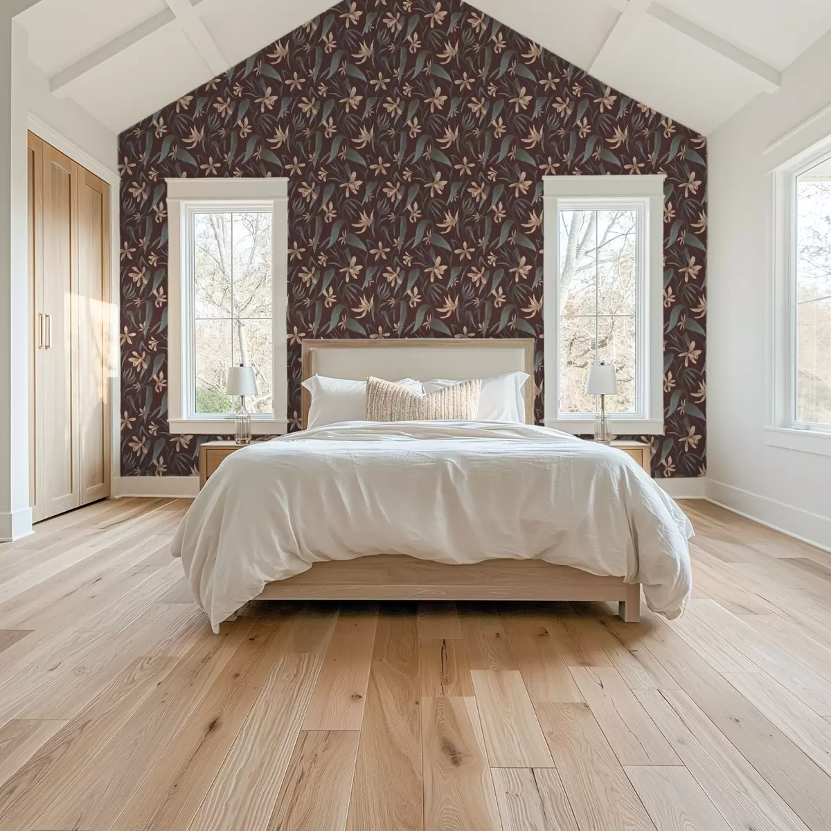 Tapetti Kermanväriset kukat harmailla lehdillä viininpunaisella taustalla Nr. a00833