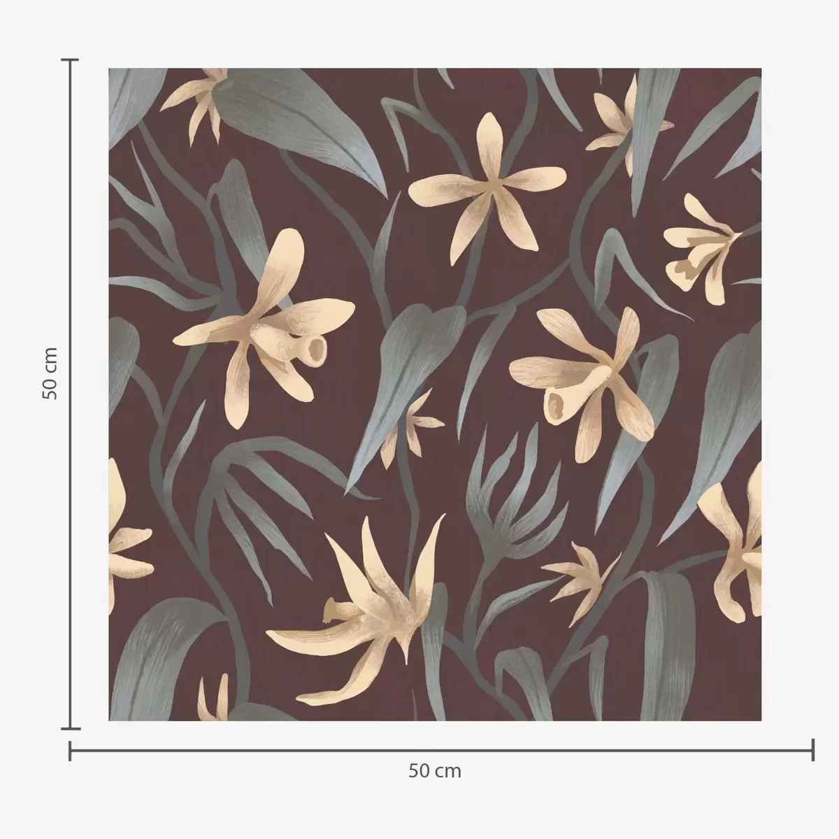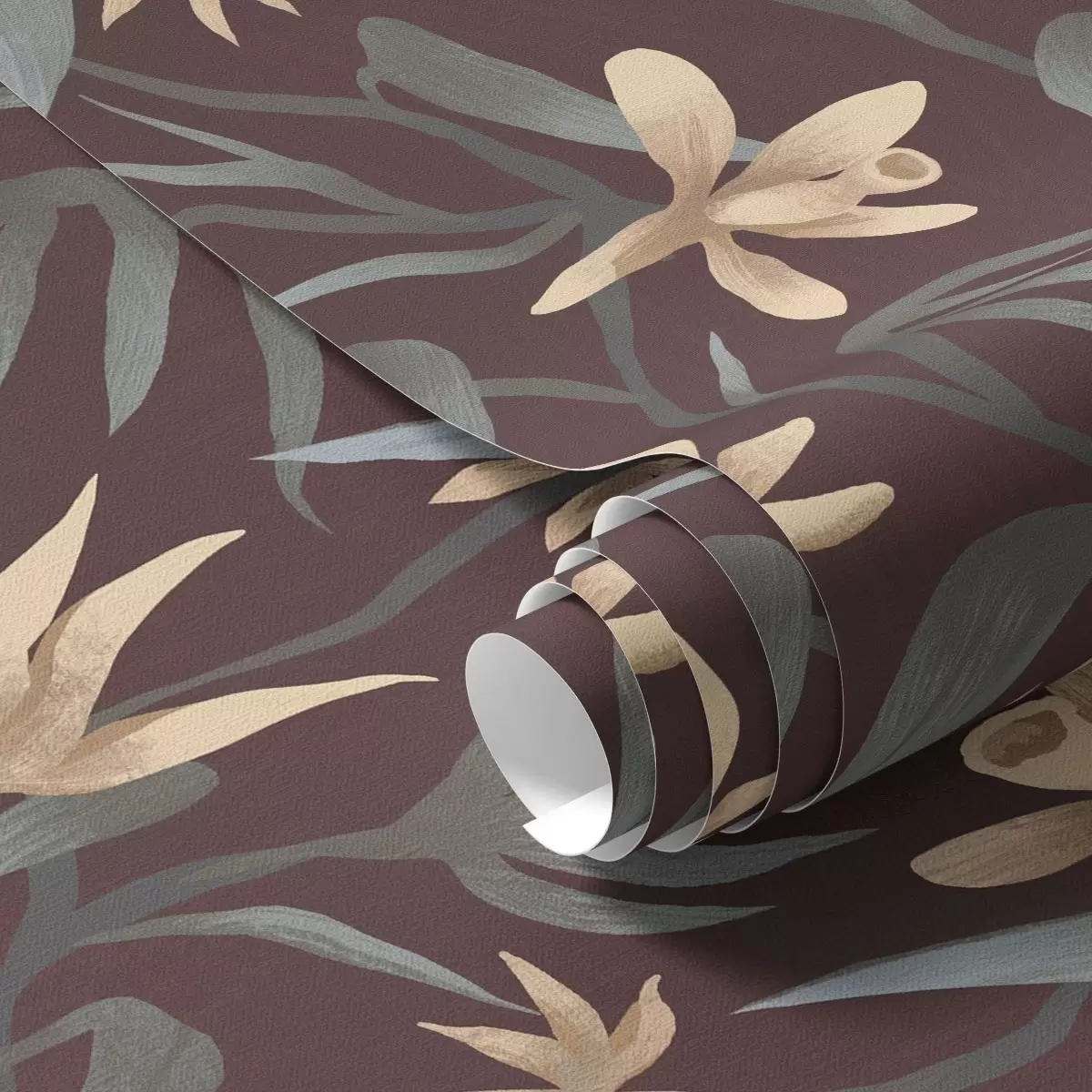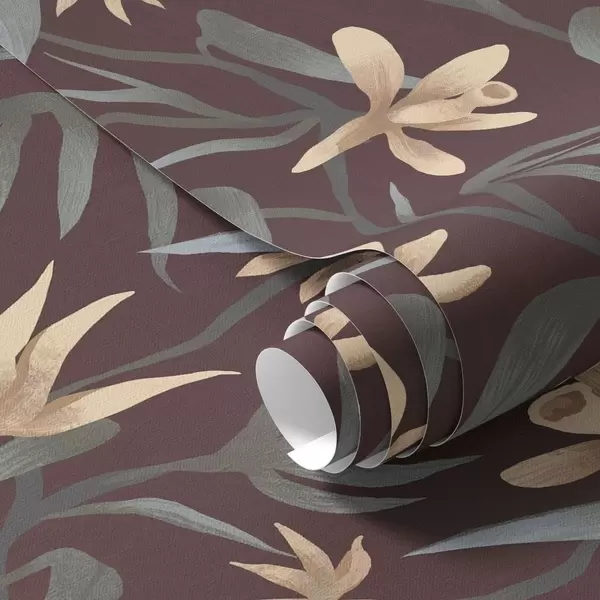 Tapetti Kermanväriset kukat harmailla lehdillä viininpunaisella taustalla Nr. a00833