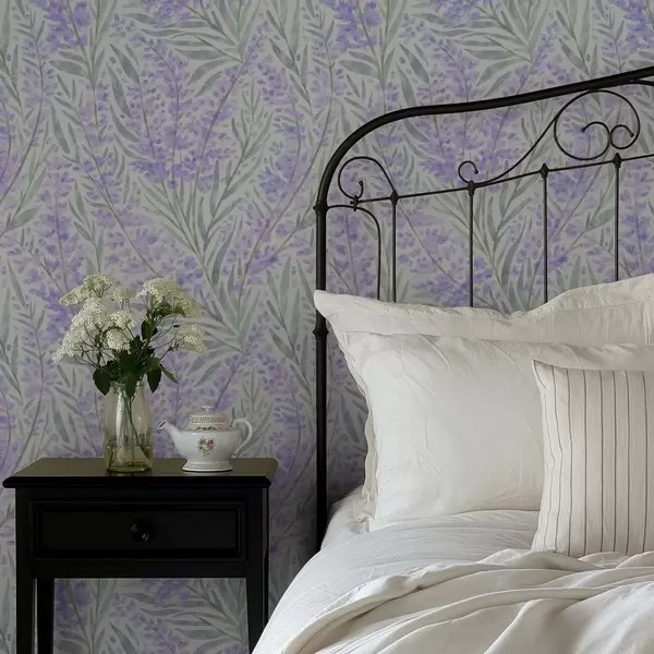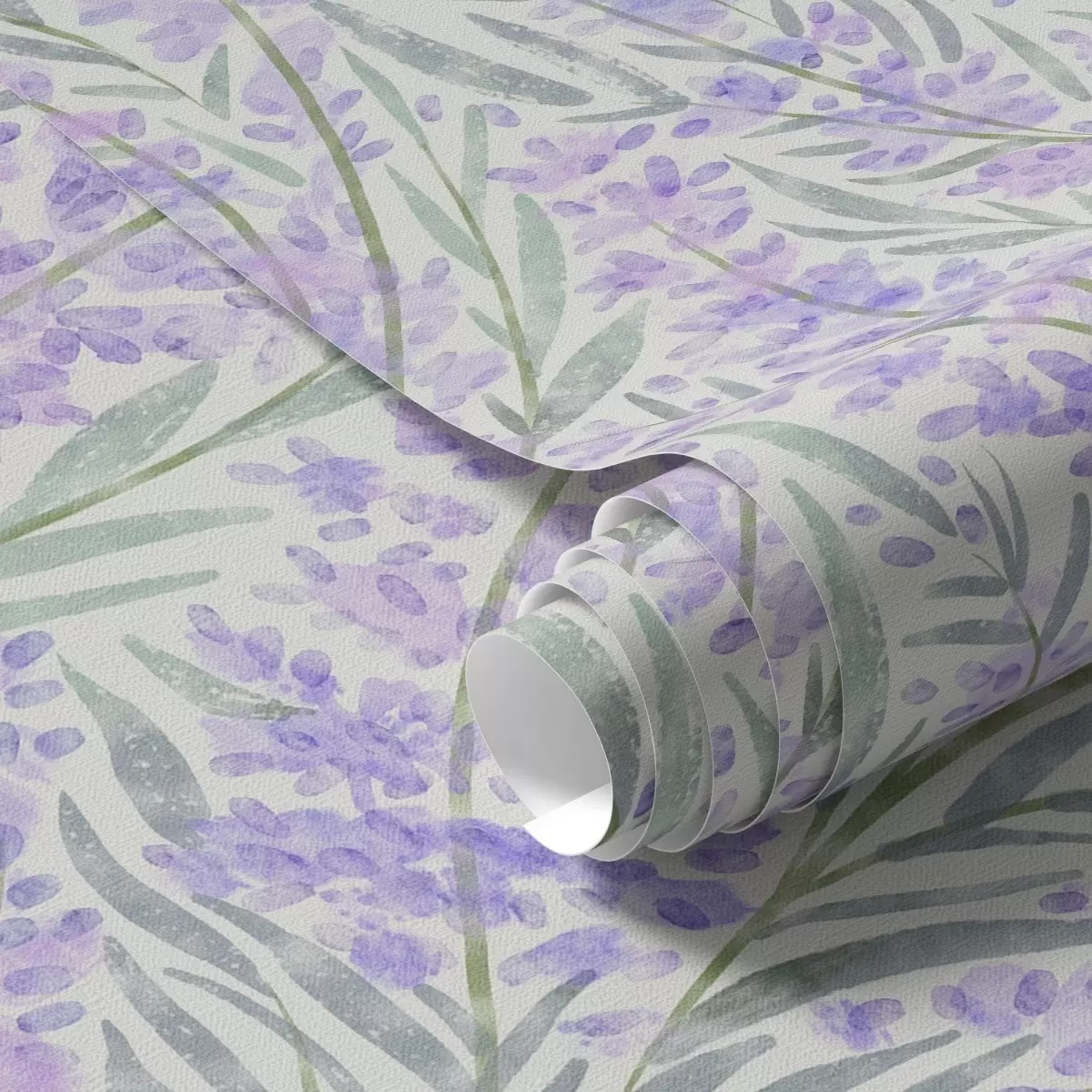 Tapetti Vaalealla taustalla violetin sävyisiä laventelin oksia Nr. a00835