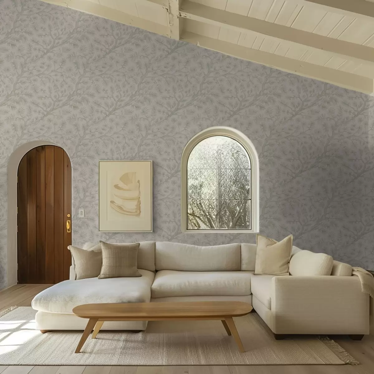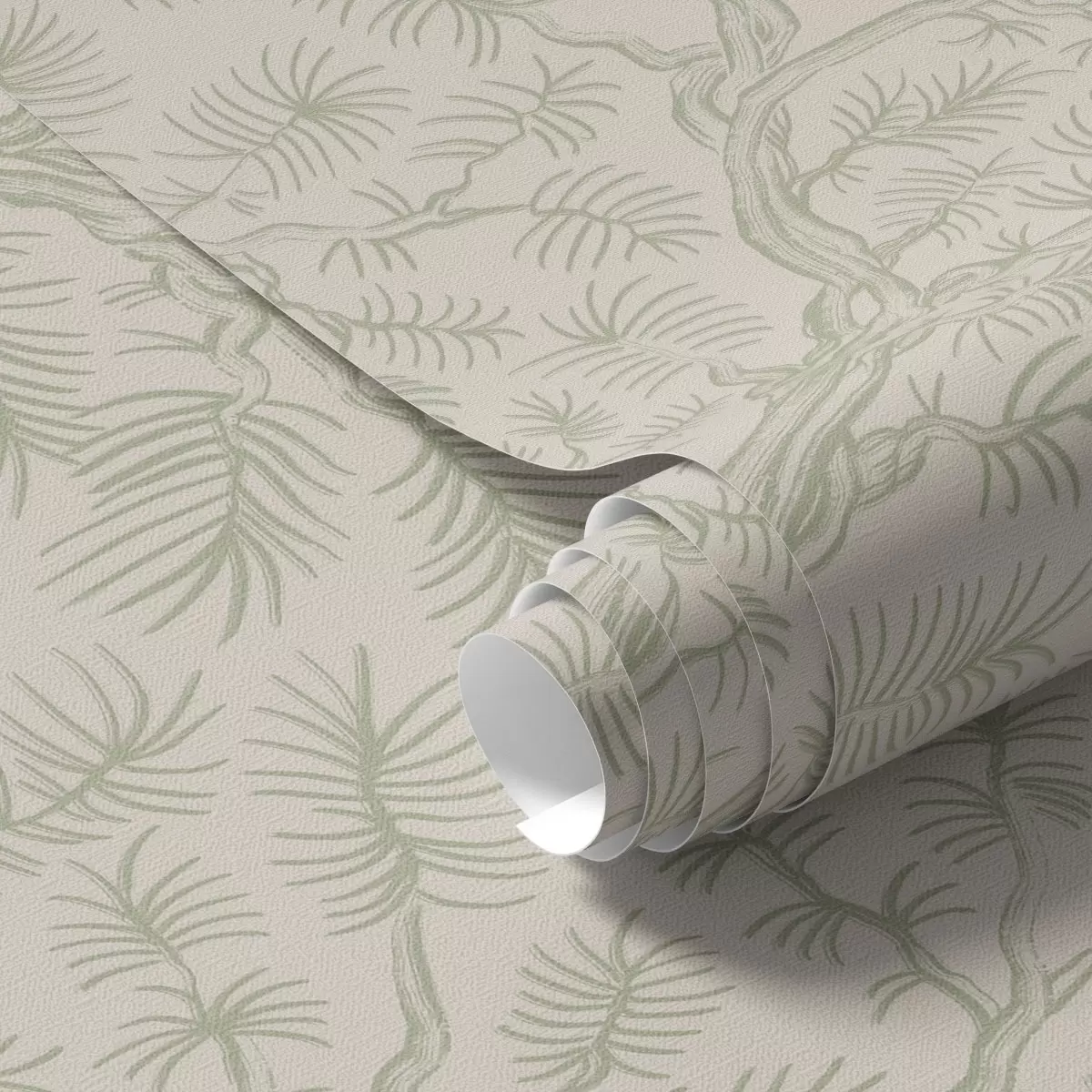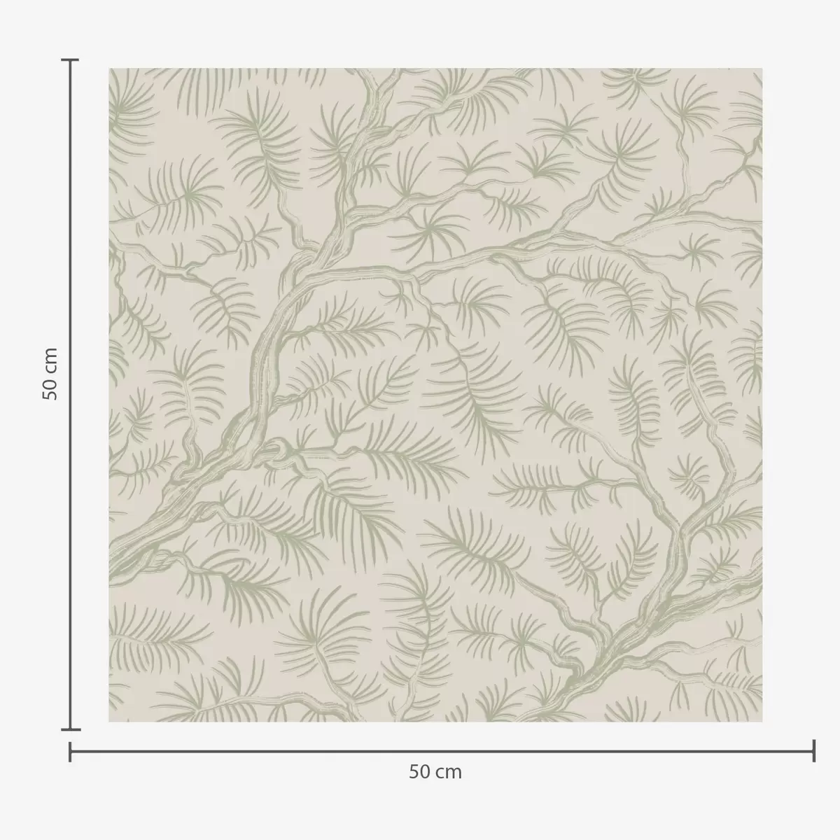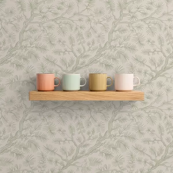 Tapetti Vaaleanvihreät männyn oksat beige-värisellä taustalla Nr. a00838v1