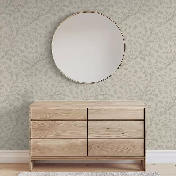 Tapetti Vaaleanvihreät männyn oksat beige-värisellä taustalla Nr. a00838v1