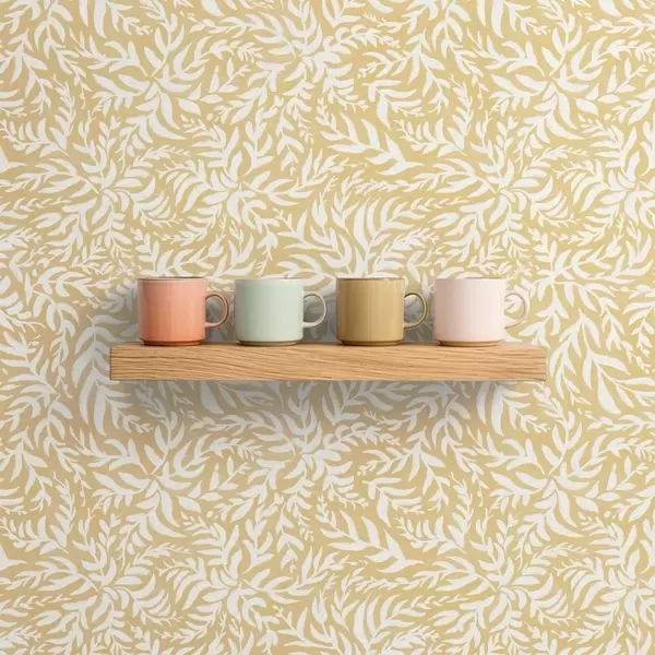 Tapetti Valkoinen lehtikuvio lämpimällä okranvärisellä pohjalla, pyörteinen rytmi Nr. a00845
