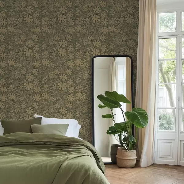 Tapetti Kentän lehdet ja ruoho harmaansävyisinä oliivinvärisinä Nr. a00847v1