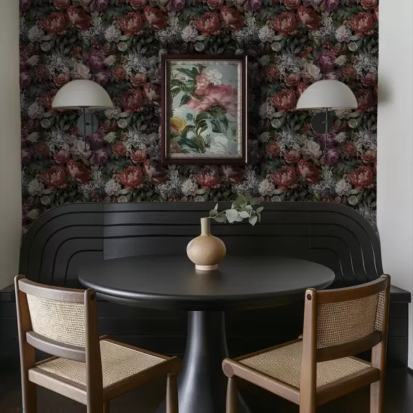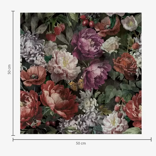 Tapetti Tummat dramaattiset pionit, marjat ja perhonen mustalla taustalla Nr. a00862