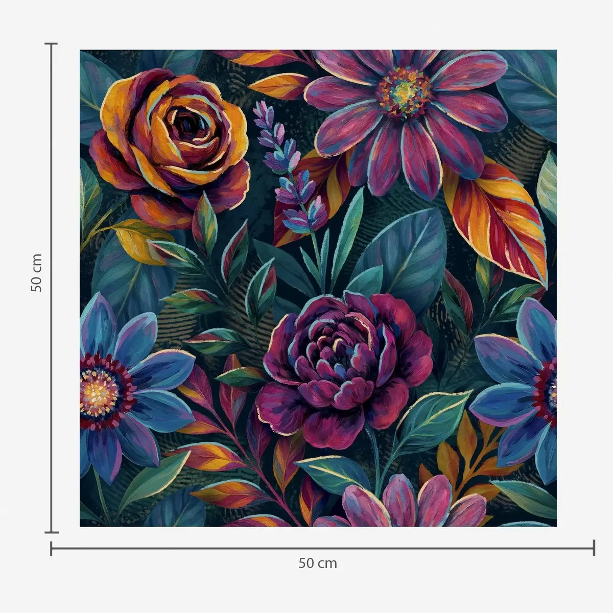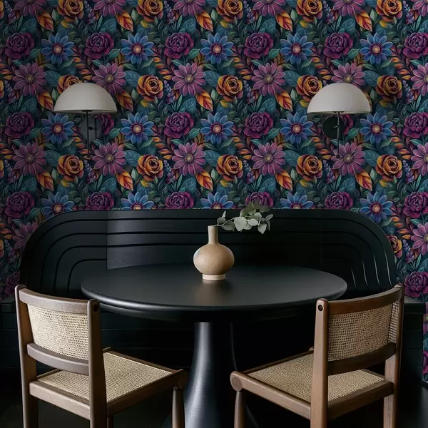 Tapetti Elävät jalokivien sävyiset kukat syvän tummansinisellä pohjalla Nr. a00871