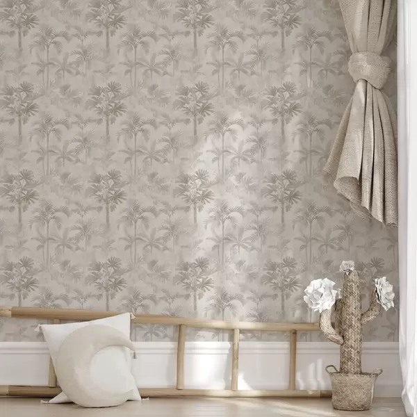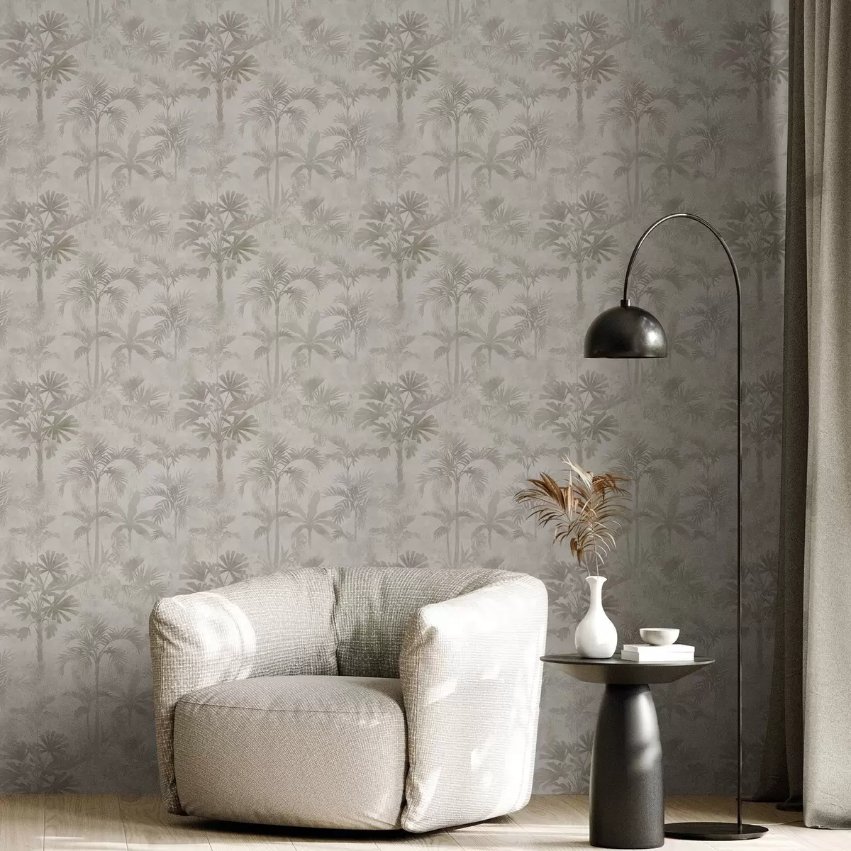 Tapetti Sumuiset palmuja kasvava lehto lämpimissä beige sävyissä Nr. a00881