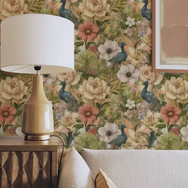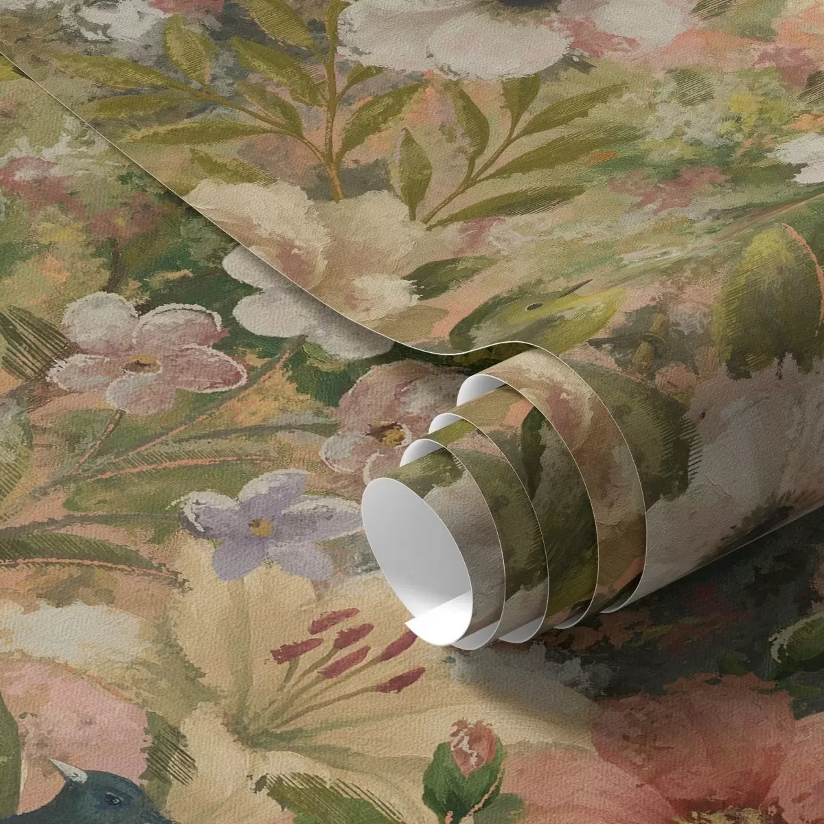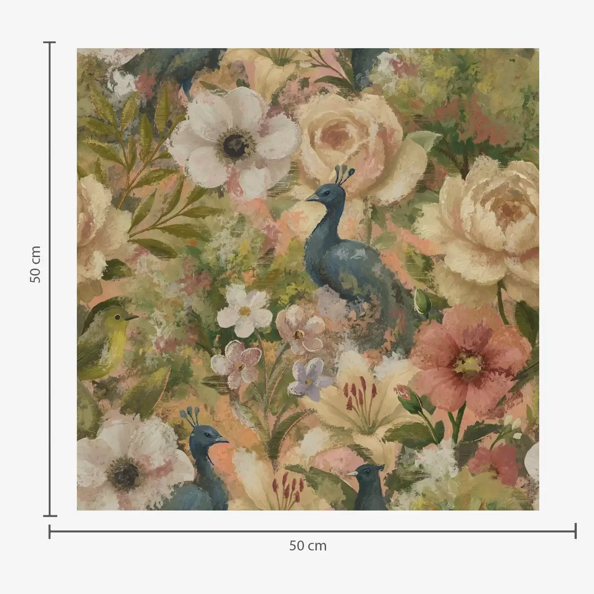 Tapetti Maalauksellinen puutarha, jossa on riikinkukkoja ja suuria kukkia Nr. a00885