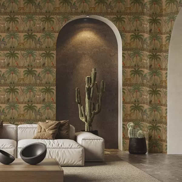 Tapetti Koristeelliset savannieläimet palmujen ja reunusten välissä Nr. a00898
