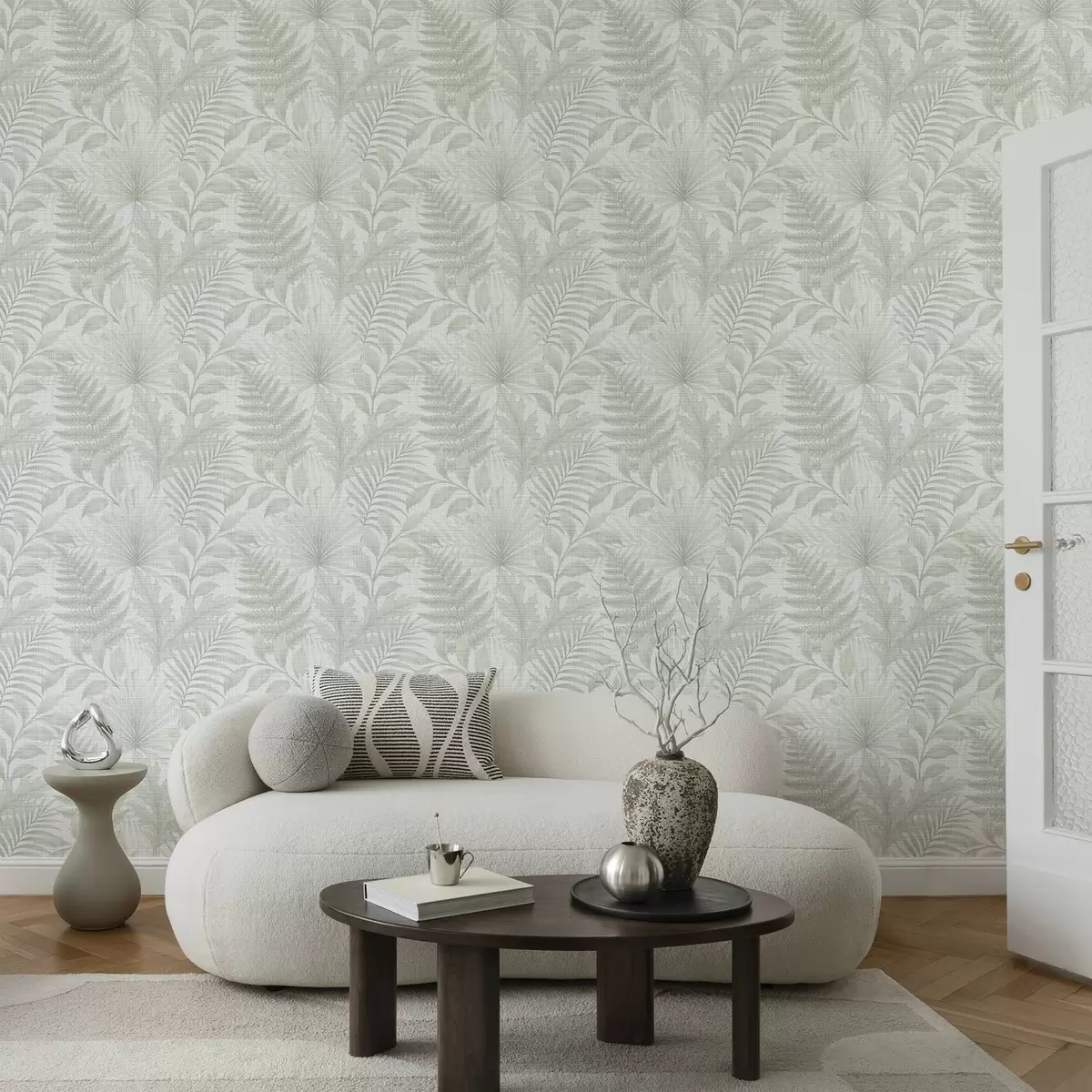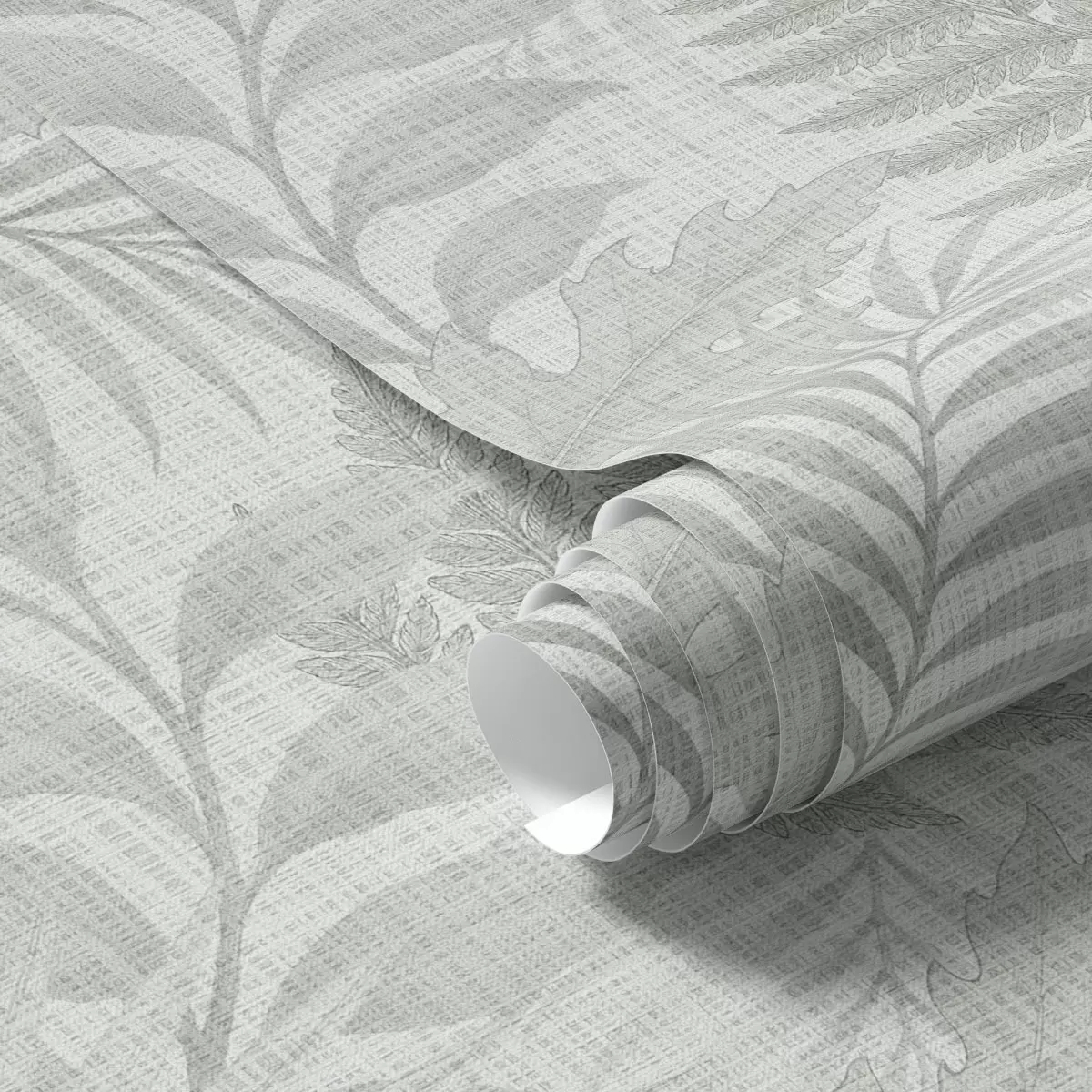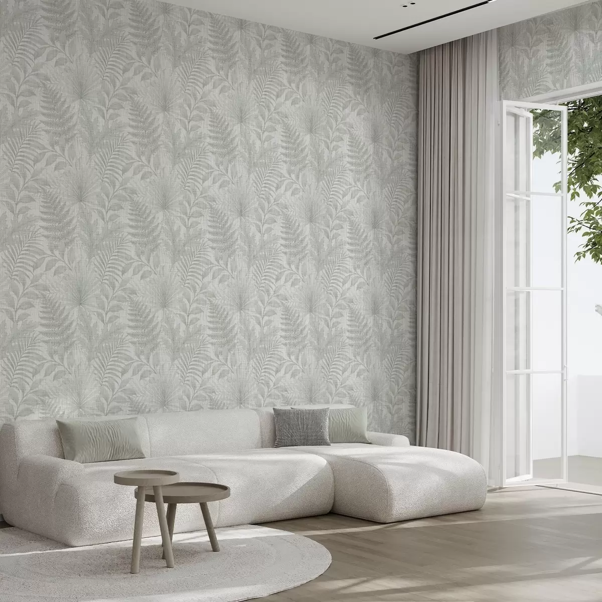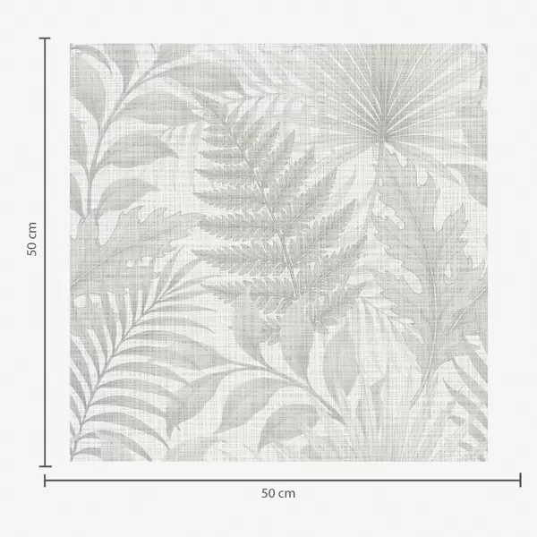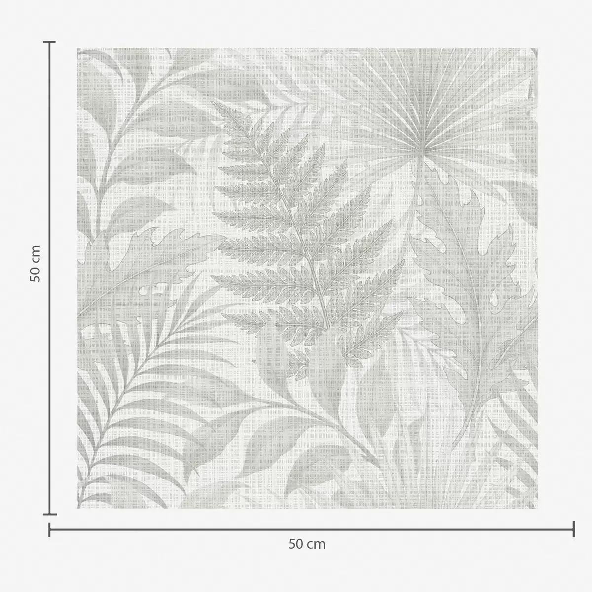 Tapetti Pehmeät trooppiset lehdet vaaleanharmaana pellavakankaalla Nr. a00899