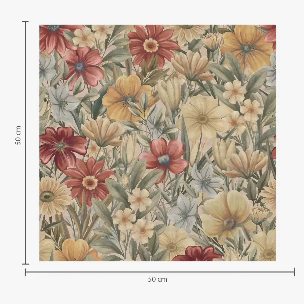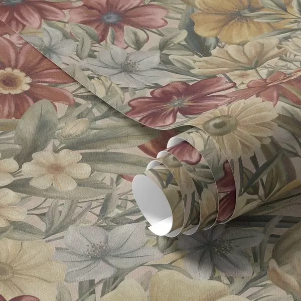 Tapetti Vintage-niitty kukkivat lämpimissä keltaisissa, punaisissa ja salviavihreissä sävyissä Nr. a00906