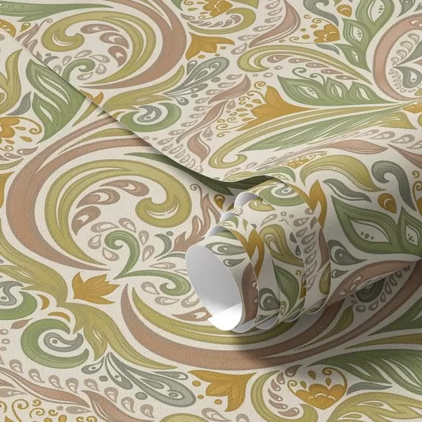 Tapetti Koristeelliset lehtikuvioiset pyörteet vihreän ja terrakottan sävyissä Nr. a00927v1