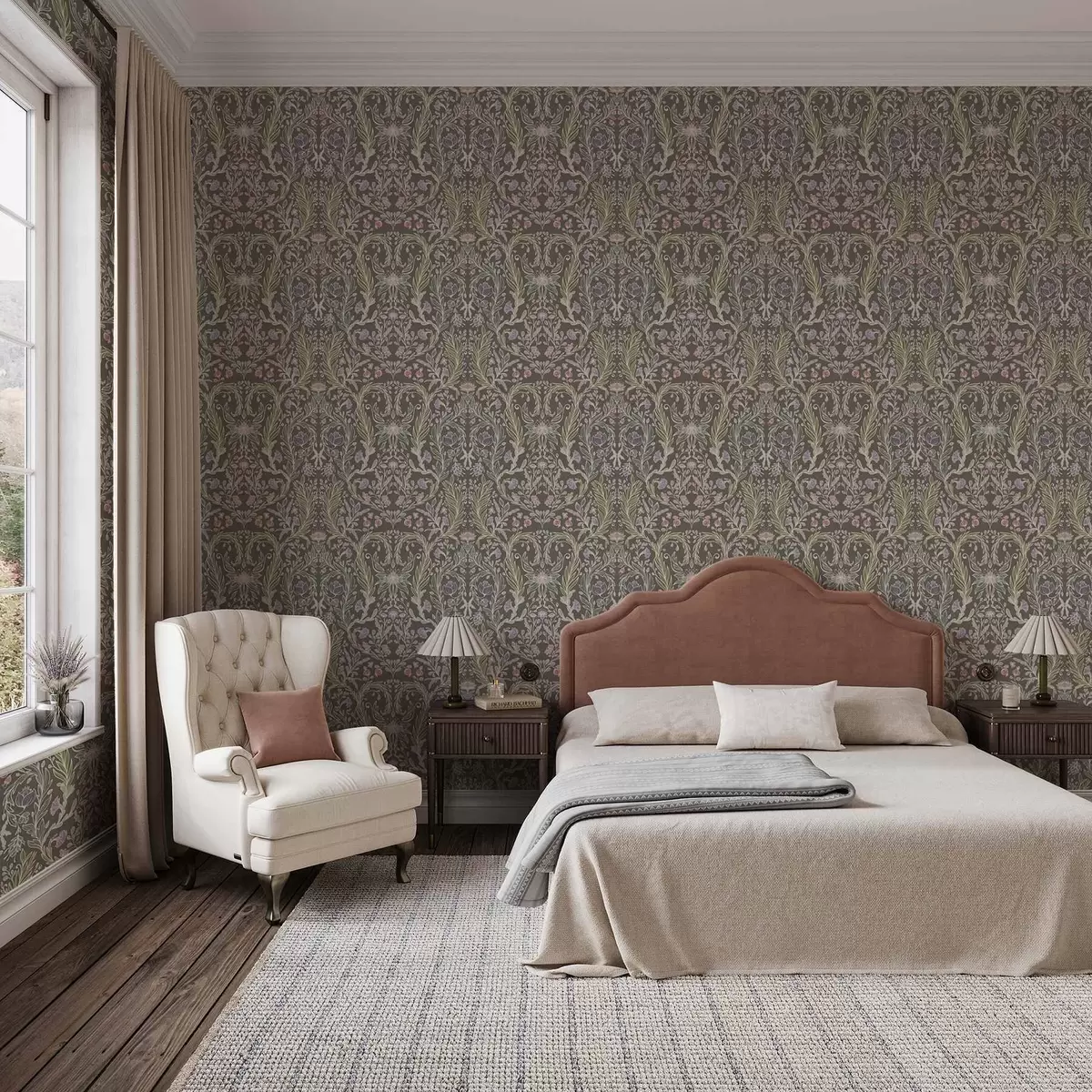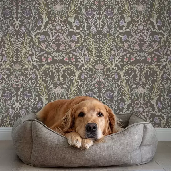 Tapetti Symmetriset kukat ja lehdet ruskeanharmaalla taustalla Nr. a00928v2