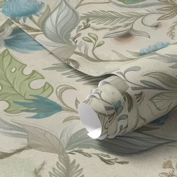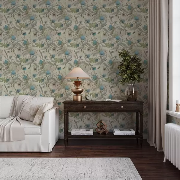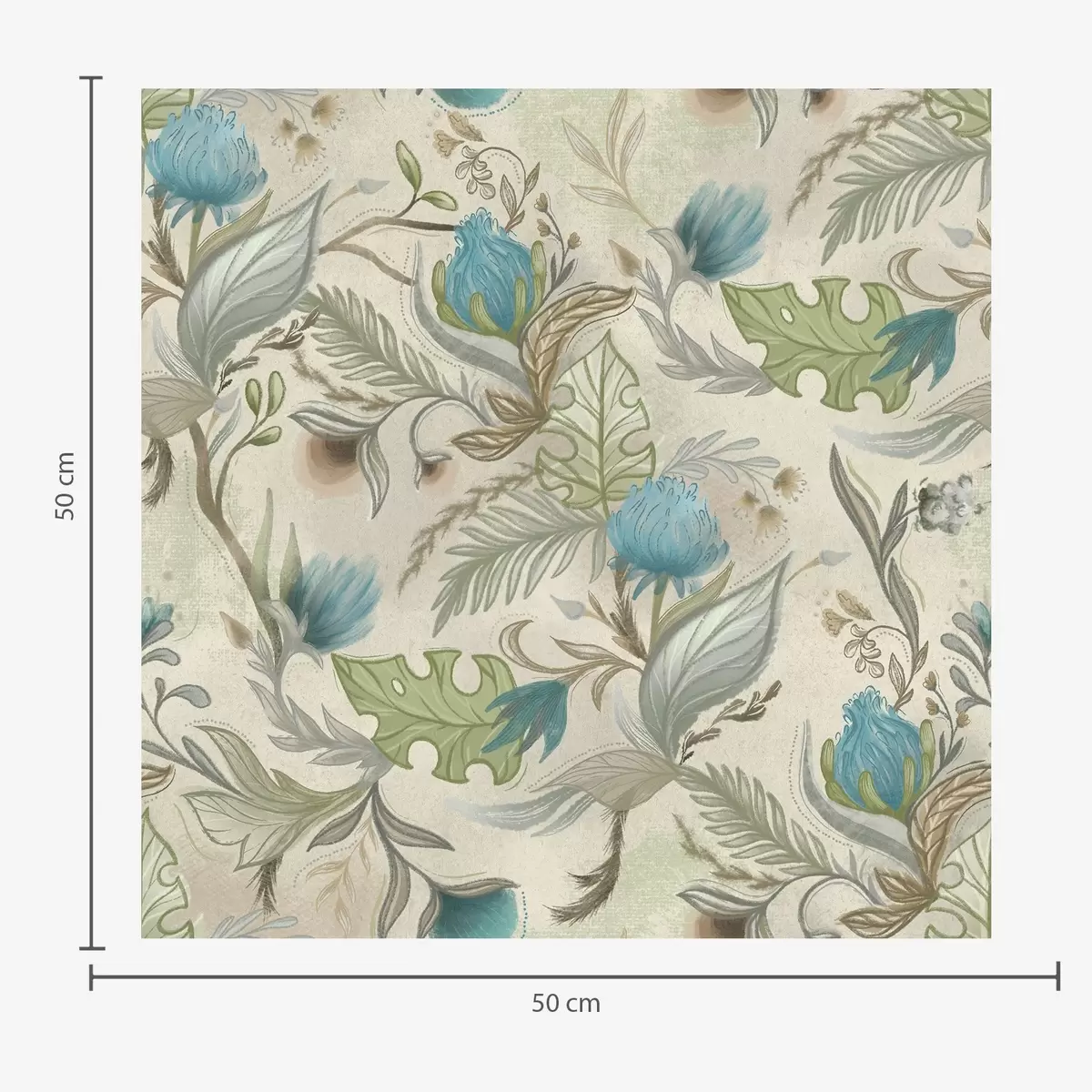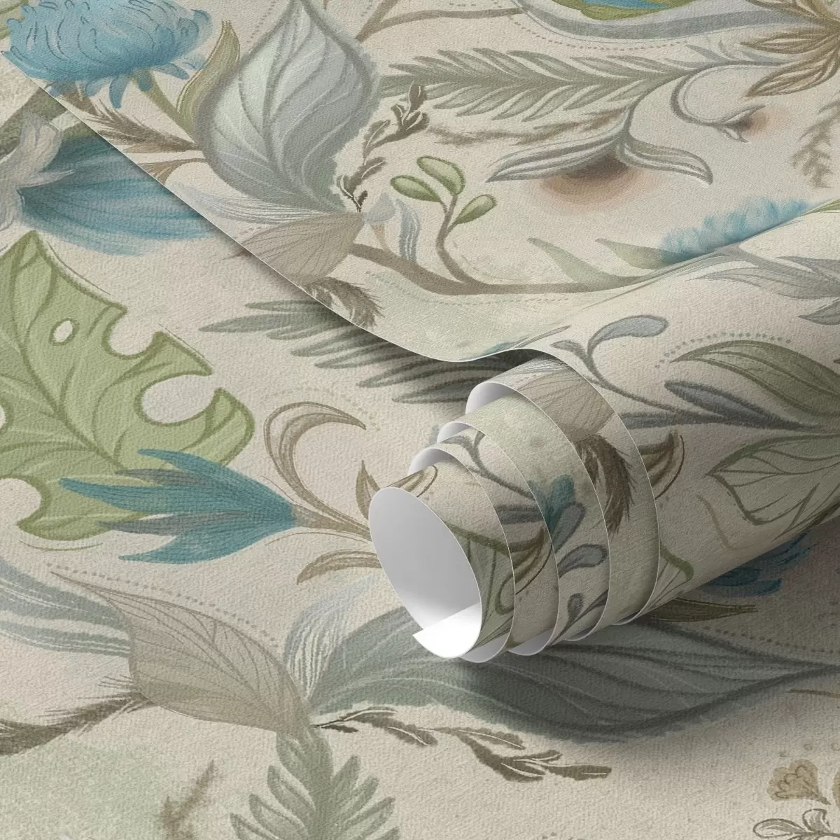 Tapetti Siniset silmut ja lehdet vaaleanbeigen taustalla Nr. a00930