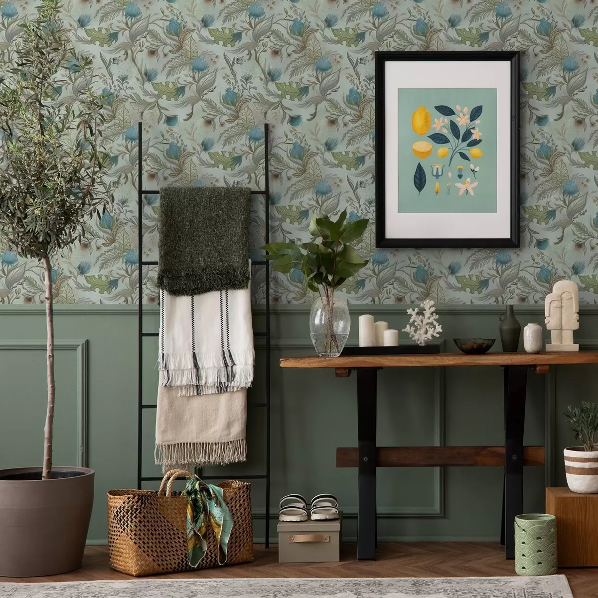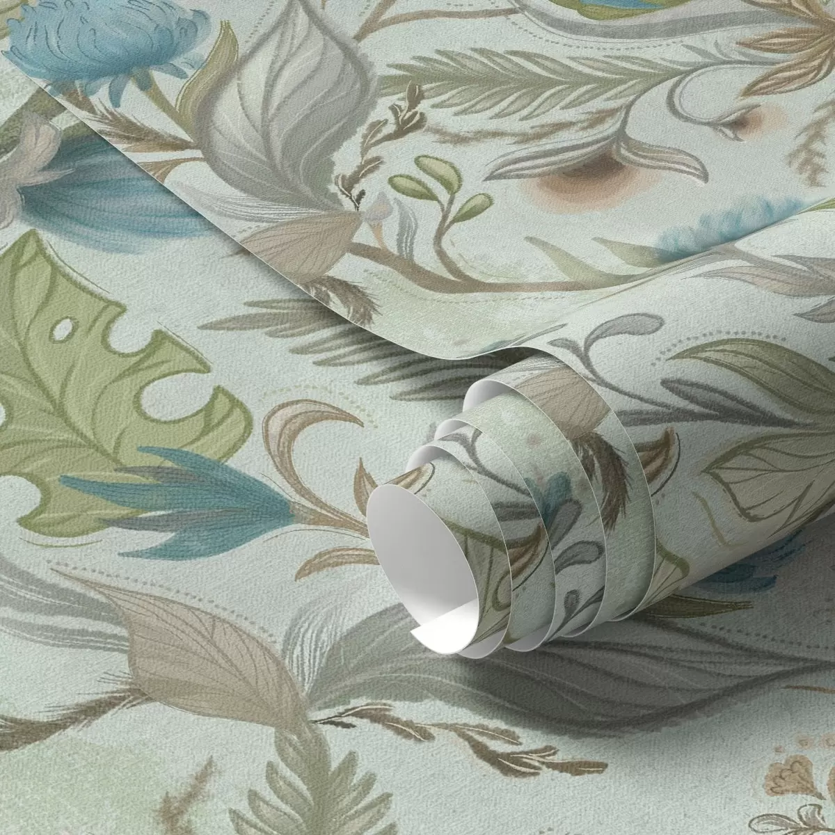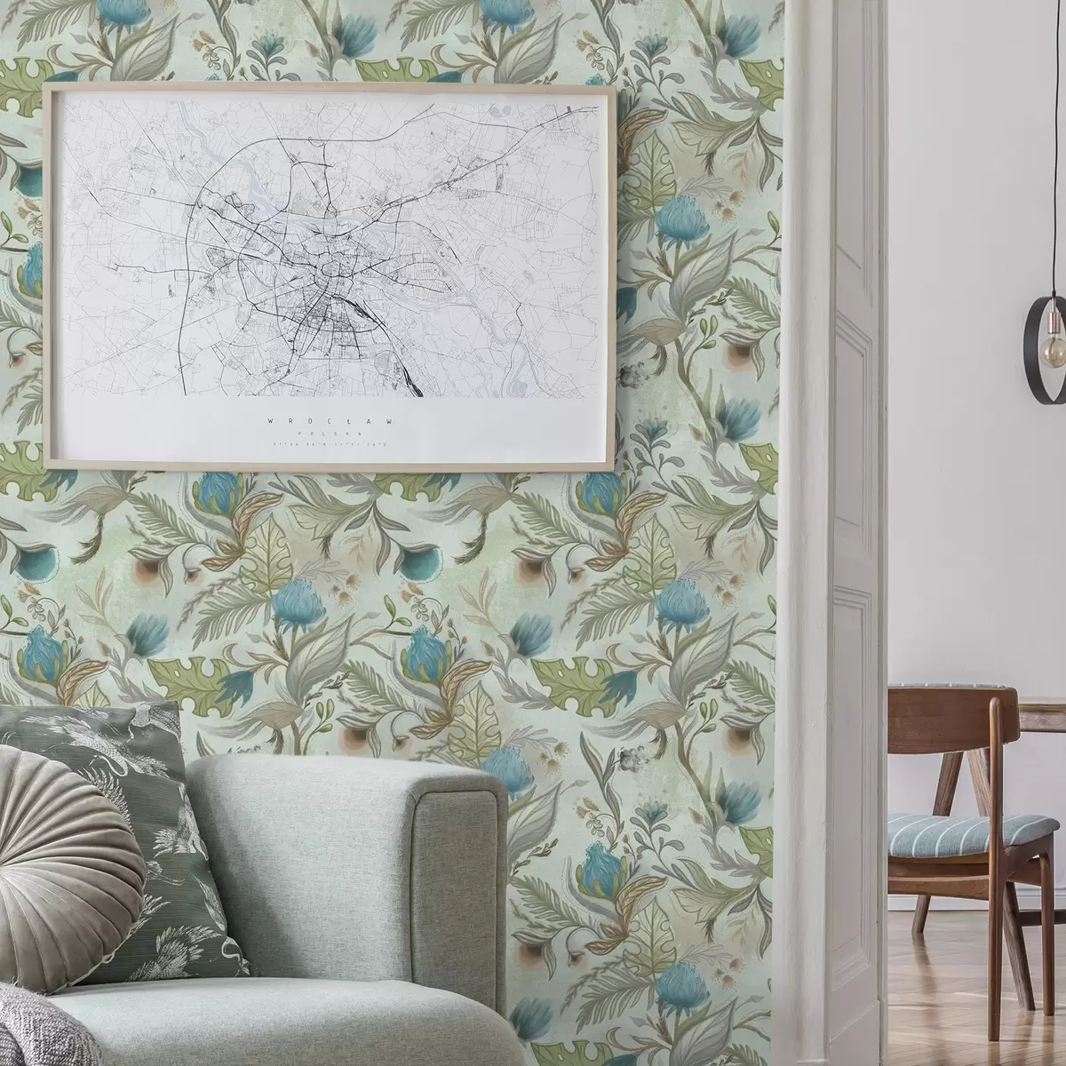 Tapetti Siniset kukat ja vihreys pehmeällä mintunvärisellä taustalla Nr. a00930v1