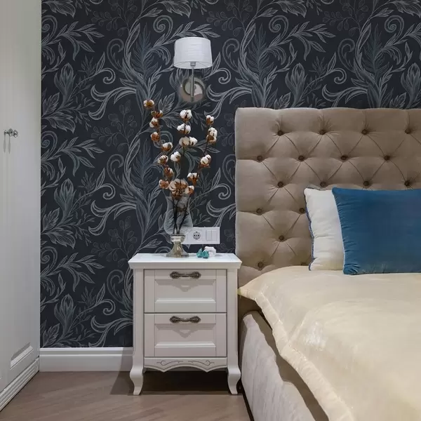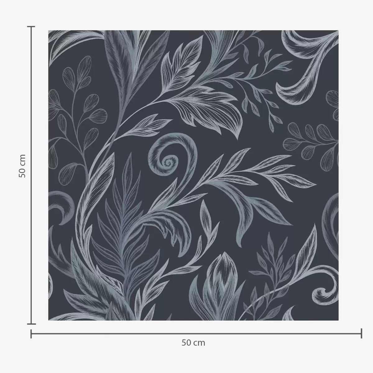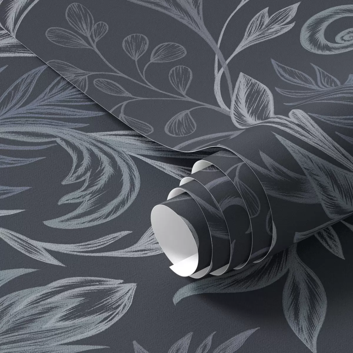 Tapetti Tumman indigonväriset käpristyneet lehdet, käsin piirretyt varjostukset Nr. a00935