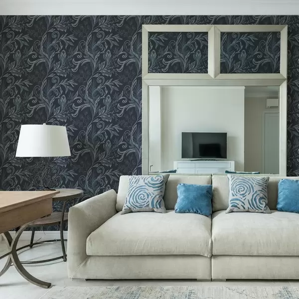 Tapetti Tumman indigonväriset käpristyneet lehdet, käsin piirretyt varjostukset Nr. a00935